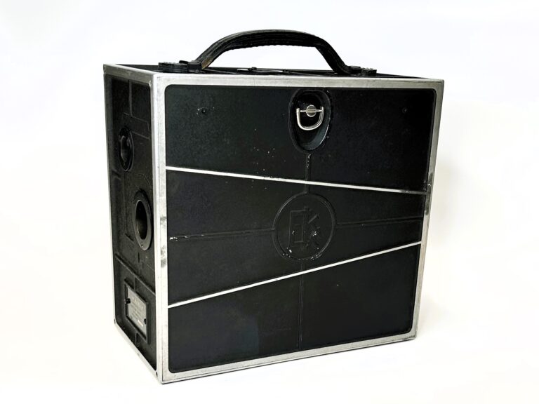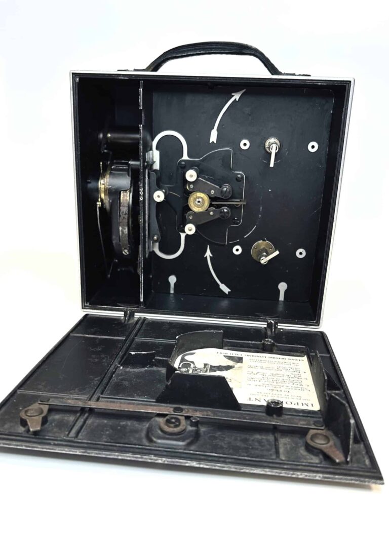 Bei diesem Museumsmodel findet sich anstatt der Handkurbel der Ankoppelungsmechanismus für einen Elektromotor und es fehlt das Wechselobjektiv.