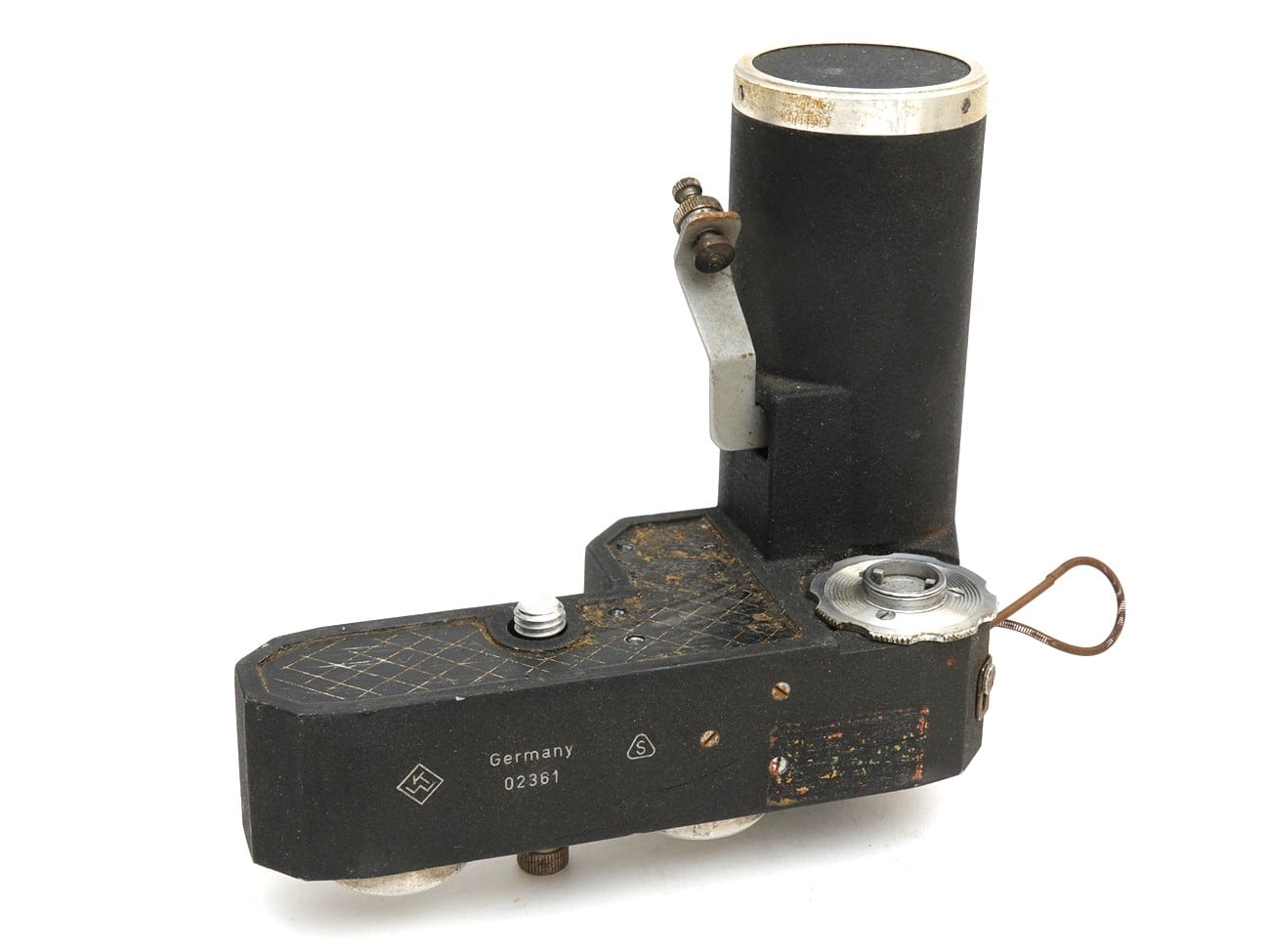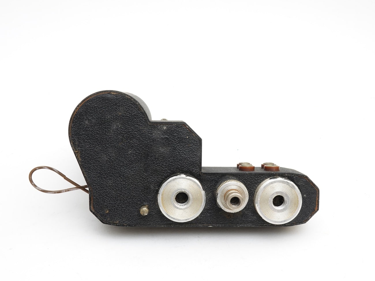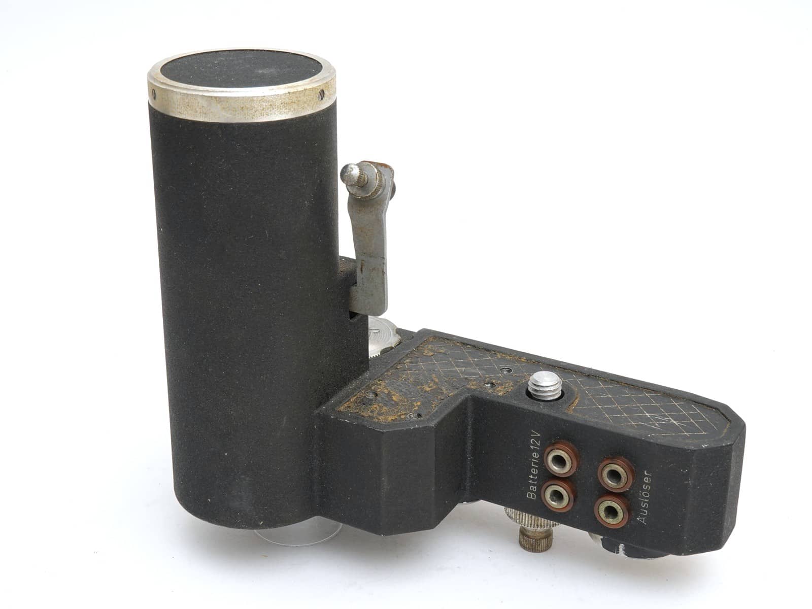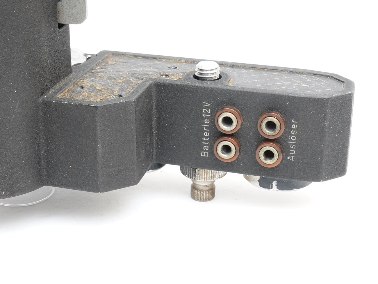 Die Anschlüsse für Batterie und Auslöser. Die Auflagefläche für die Kamera war ursprünglich vermutlich beledert.