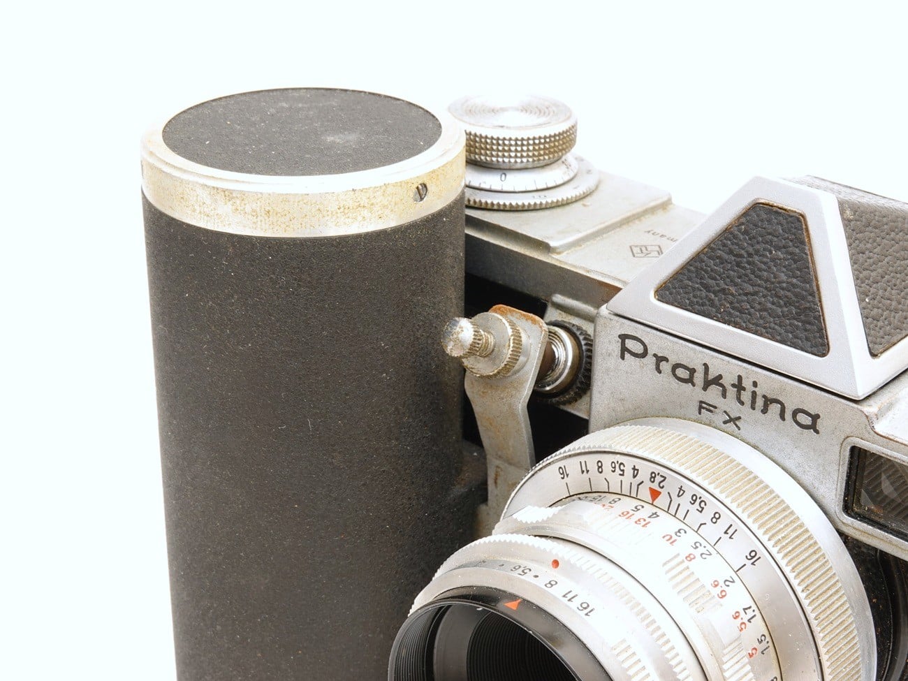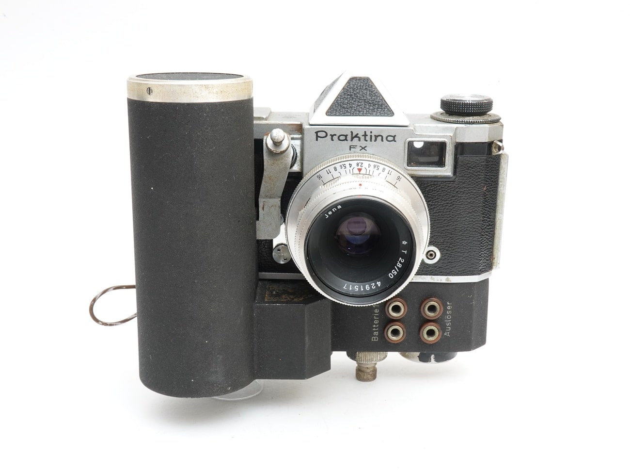 Elektromotorischer Antrieb für die Praktina IIa, hergestellt in der DDR. Kameraanschluss 3/8″, zwei Stativanschlüsse 3/8″; Anschlüsse für Batterie (12 Volt) und elektrischen Auslöser.