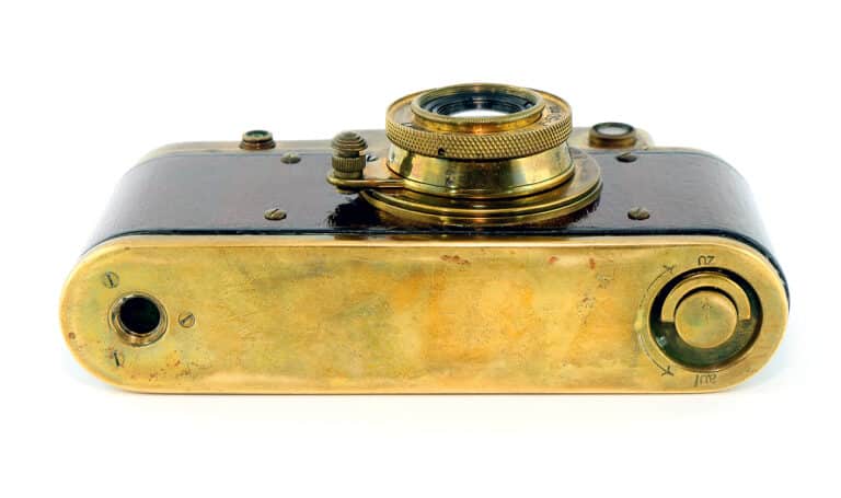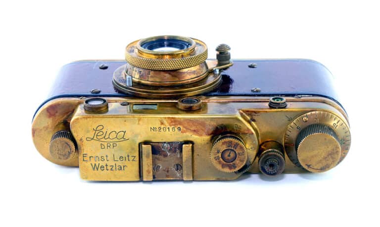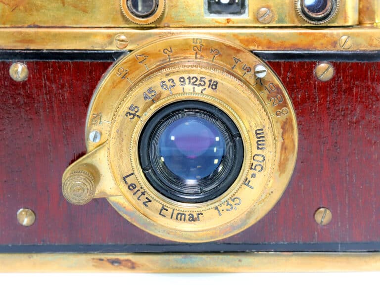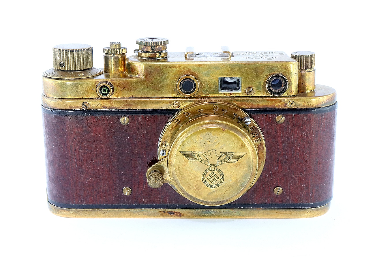 Diese russische Kleinbildkamera – optisch und technisch eine KMZ Zorki C – soll dem unbedarften Sammler eine wertvolle Leica vorspiegeln, weshalb man auf der Deckkappe den Leica-Schriftzug nachgeahmt hat, dazu die Beschriftung „D. R. P.“ (für Deutsches Reichs-Patent) und „Ernst Leitz Wetzlar“. Als Seriennummer wurde willkürlich die „20169“ eingraviert. Demnach müsste das eine Leica I von 1929 sein (im Nummernkreis von 13301 bis 21478), aber schon das zeigt, dass das nicht stimmen kann. Es gibt „bessere Fälschungen“, bei denen die Kamera wenigstens aussieht wie eine Leica und nicht wie eine Zorki aus den 1950er Jahren. Wenigstens hat man darauf verzichtet, auf dem Zorki-Body ein Hakenkreuz einzugravieren. Ein Hakenkreuz findet sich auf dem Objektivschutzdeckel. Diese dunkelbraune „Belederung“ mit dünnem Furnierholz gab es auch nie original bei Leitz.