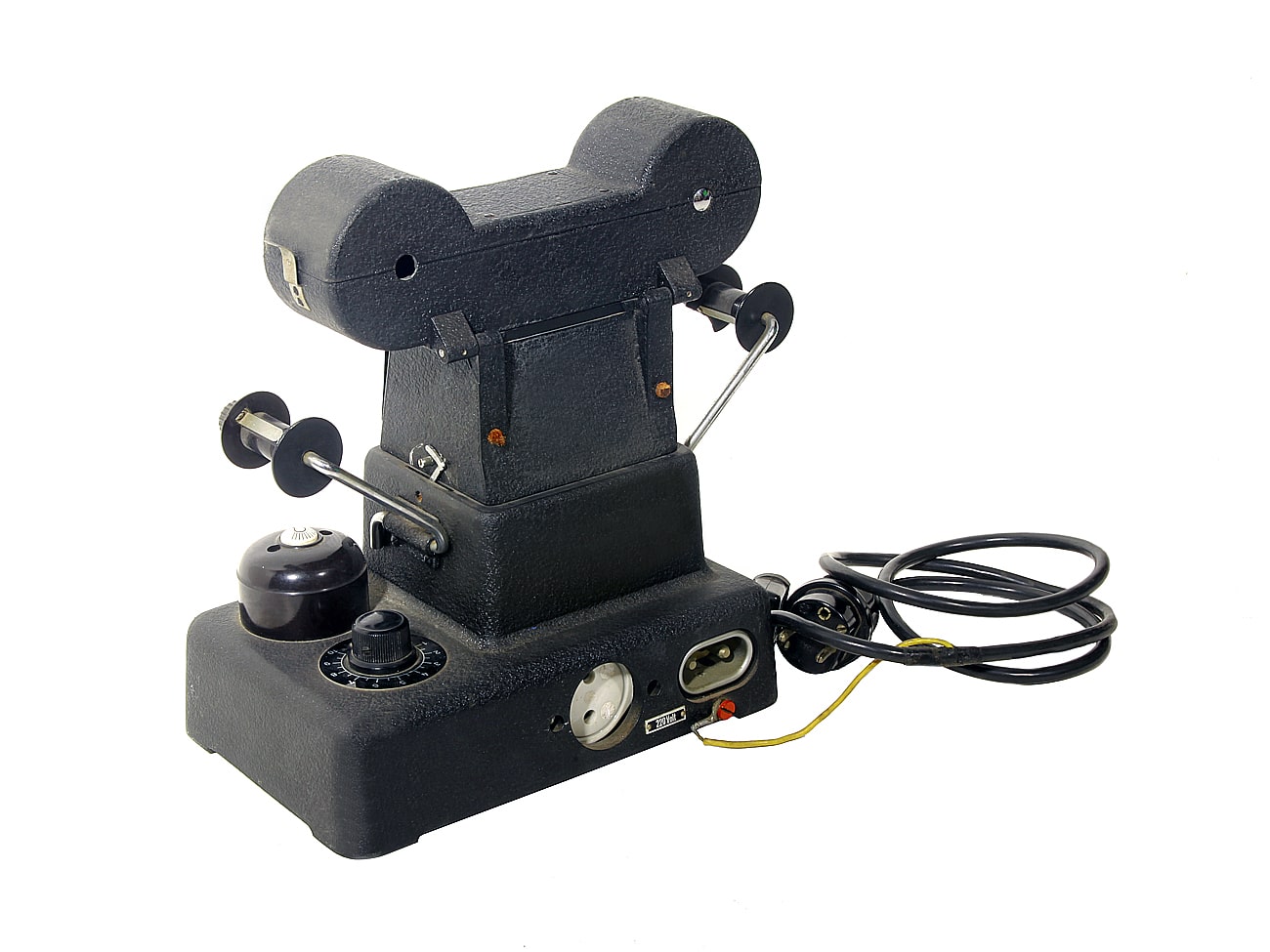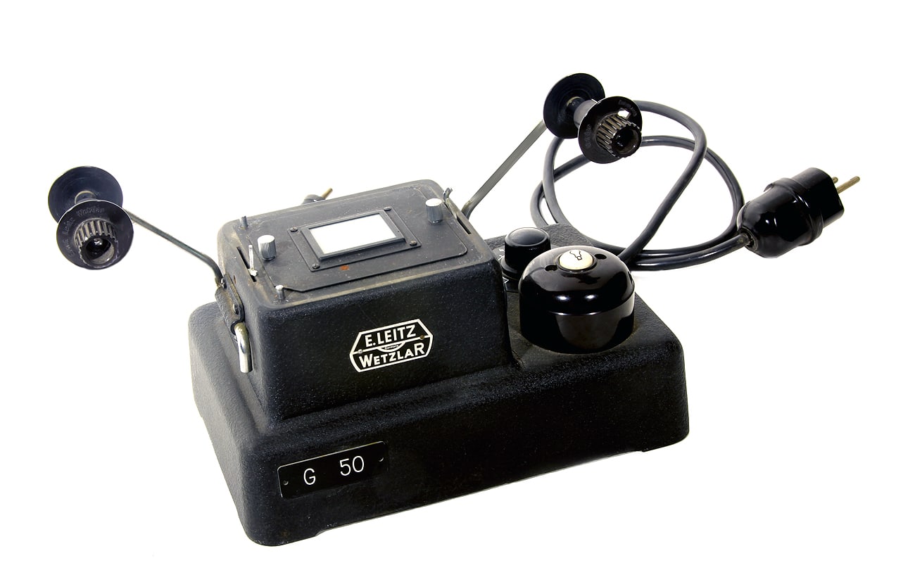 Professioneller Kopierapparat von Ernst Leitz Wetzlar aus den 1930er Jahren, bestehend aus Grundgehäuse und Diafilmaufsatz für bis zu zehn Meter Diafilm. Neben einem kleineren Diapositivkopierer für Amateure (Leitz-Telegraphie-Wort: ELDUR und ELDIA) bot Leitz für die professionelle Anwendung diese Durchleuchtungseinrichtung zur Erstellung von Kontaktkopien auf Positivfilm an.