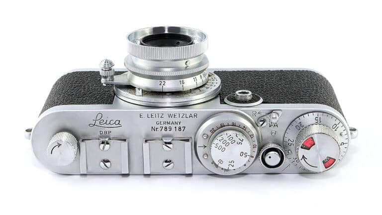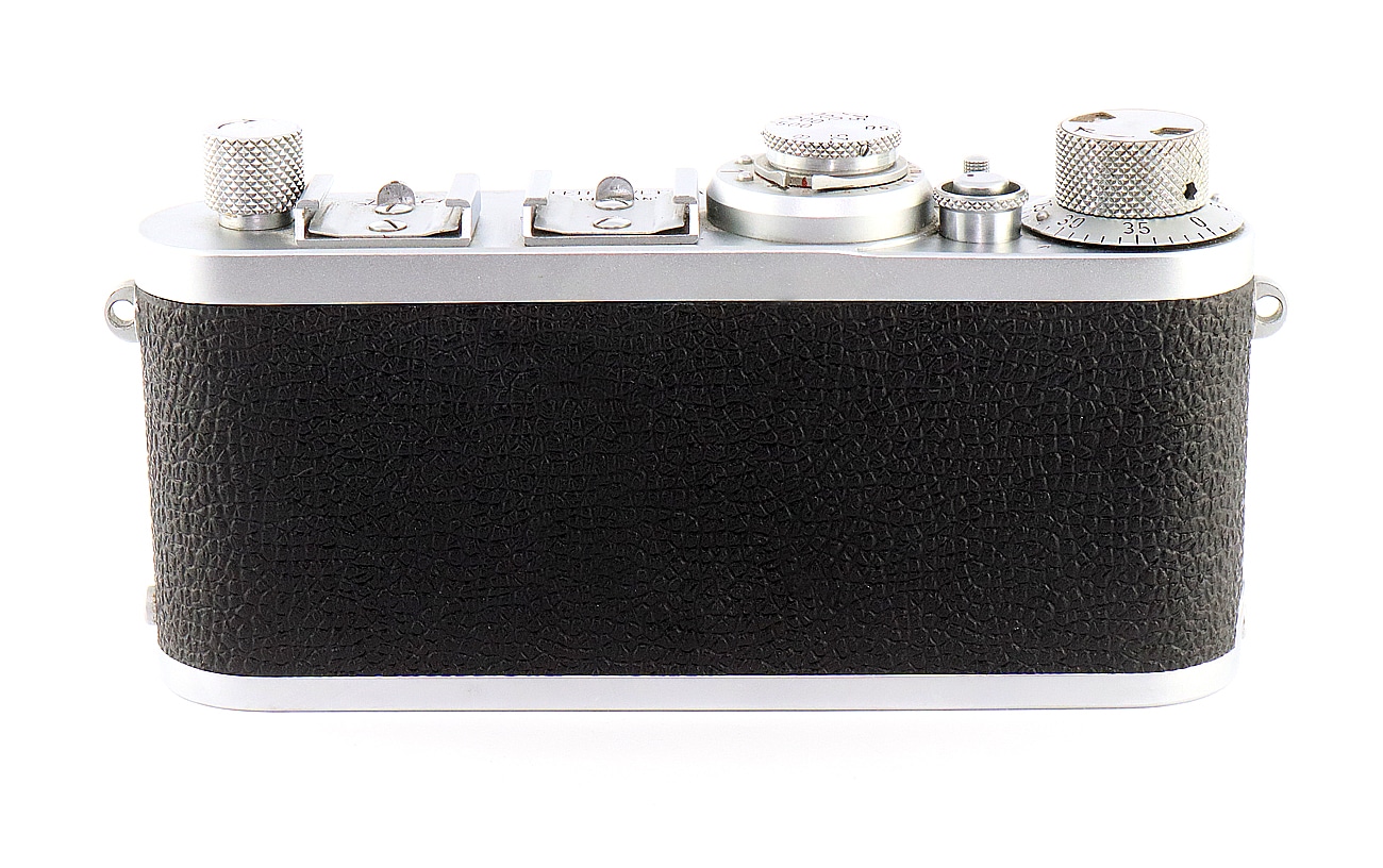 Seltene Schraub-Leica (1952 bis 1957) für den Kleinbildfilm 135 (Aufnahmeformat: 24 x 36 mm). Kein optisches Suchersystem, nur zwei Zubehörschuhe auf der Deckkappe. Wechselobjektive mit M-39-Schraubgewinde – hier mit dem leichten Weitwinkel Leitz Summaron 1:3,5/35 mm (Seriennummer: 1220268; kürzeste Einstellentfernung: 1 Meter, kleinste Blende: 22). Schlitzverschluss mit der alten Verschlusszeitenreihe B sowie 1/25 – 1/50 – 1/75 – 1/100 – 1/200 und 1/500 Sekunde. Blitzsynchronbuchse.