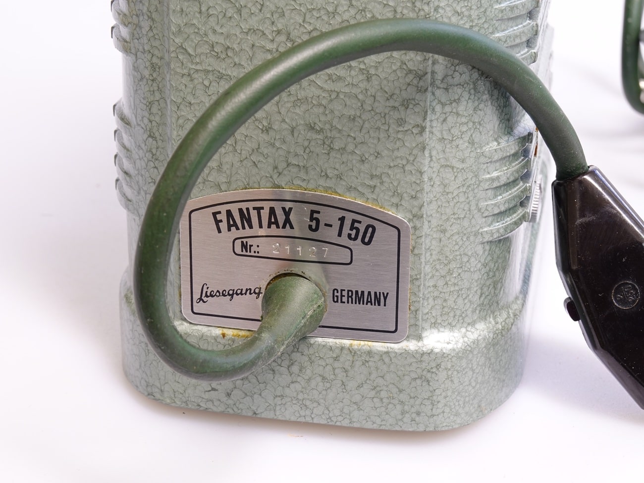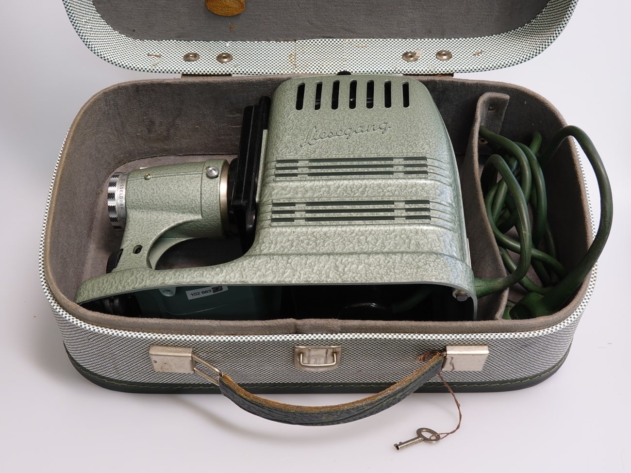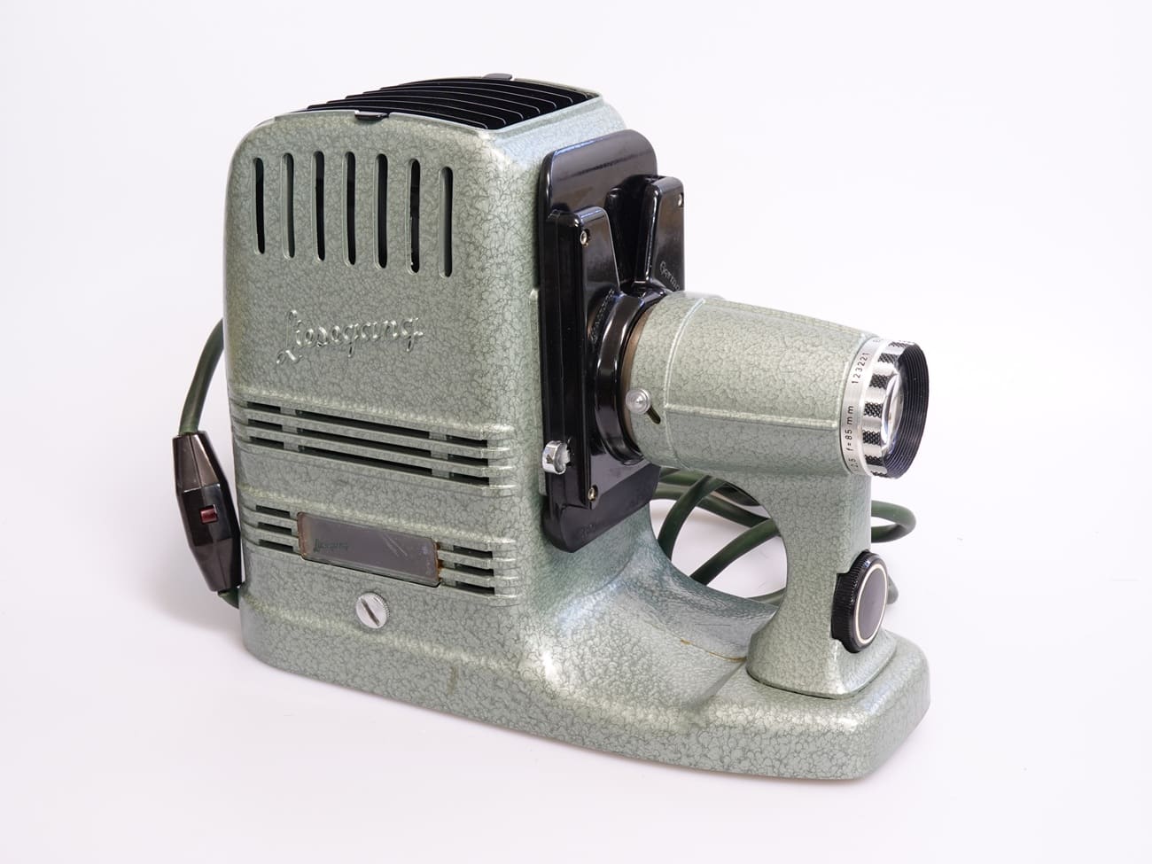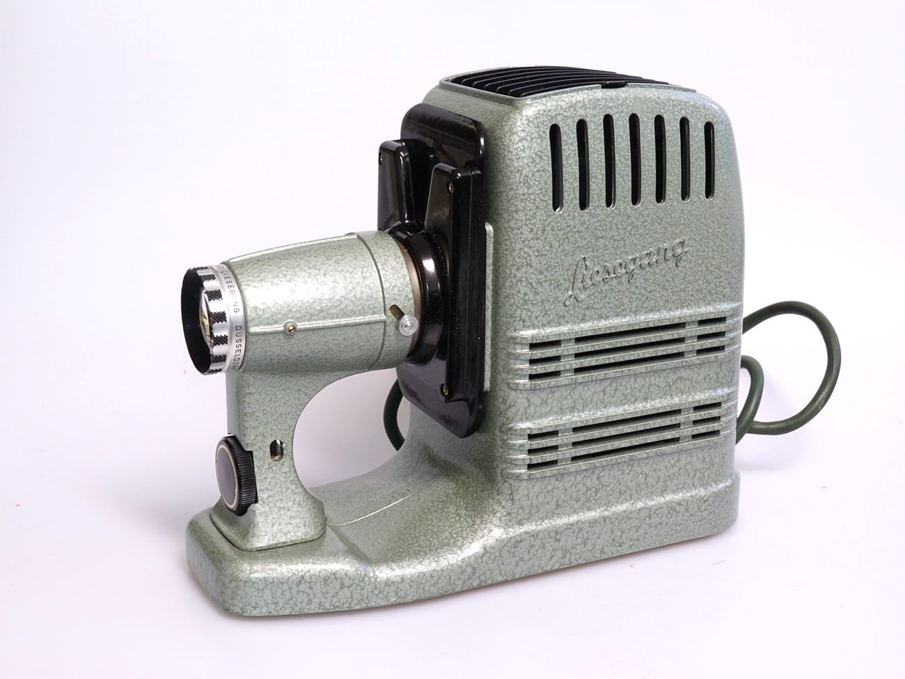 Projektor für Kleinbilddias, hergestellt ab 1955. Objektiv: Liesegang Düsseldorf Sankar 1:2,5/85 mm, Seriennummer 123221. Austauschbarer Fallschacht. Netzanschluss mit Schalter. Metallgehäuse mit grünem Hammerschlaglack; Netzkabel und Transportkoffer darauf farblich abgestimmt. Schriftzug „Liesegang“ auf dem Lampengehäuse reliefiert. Beleuchtung: 230 Volt/150 Watt. Es gab auch eine Version 5-300 mit 300-Watt-Lampe, dann mit Ventilator und einem Magazinansatz mit Schnellwechsler.