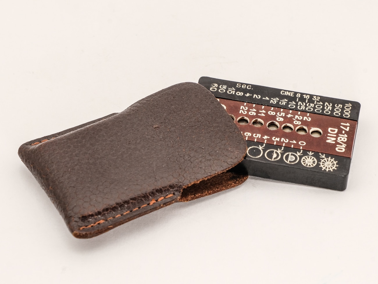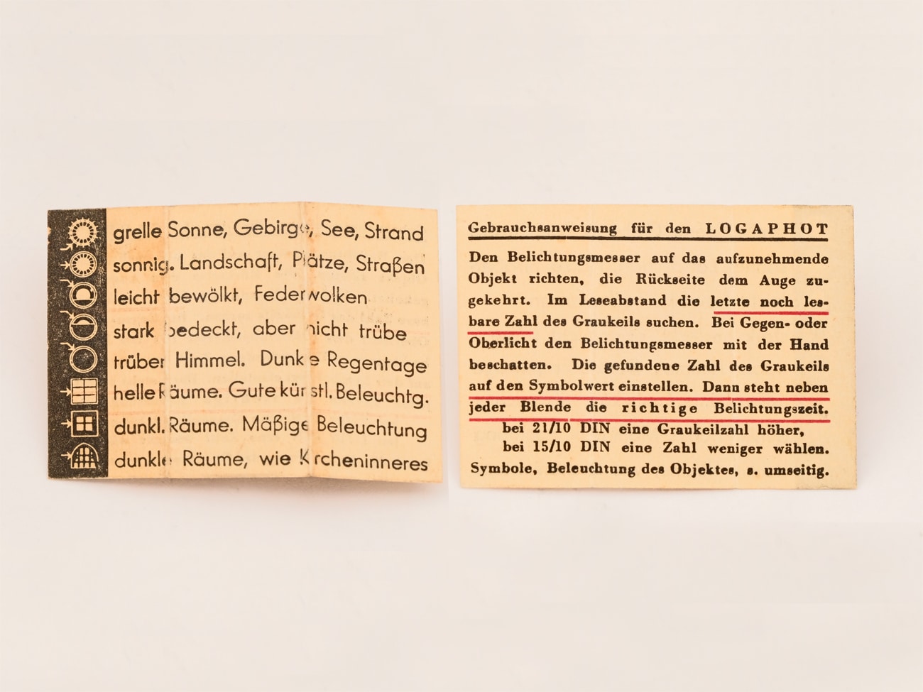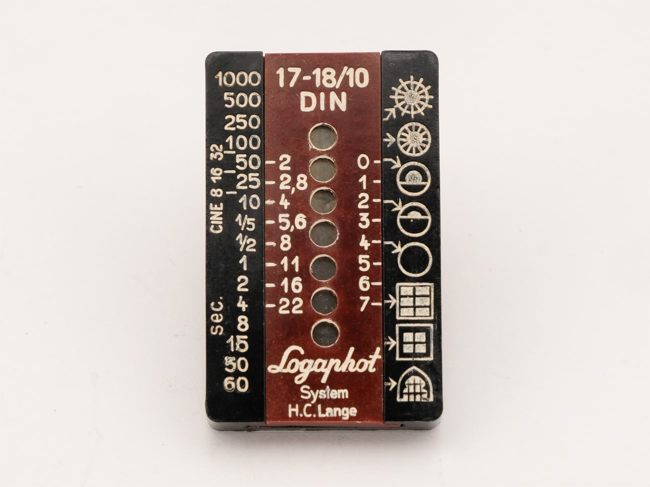 Optischer Belichtungsmesser, Ende der 1930er Jahre. Dieses kleine Gerät verwendet das Messprinzip des transparenten Graukeils, hinter dem eine Zahlenreihe angeordnet ist. Die gerade noch erkennbare Zahl in der Lochreihe wird einem Symbol der Aufnahmesituation rechts gegenübergestellt, die Belichtungsdaten können dann links abgelesen werden. Die Ergebnisse passen für eine Filmempfindlichkeit von DIN 17 bis 18. Der Logaphot wurde in vielen verschiedenen (Farb-) Varianten angeboten. Identisch im Aufbau, aber größer und umfangreicher in der Ausstattung waren die Addiphot-Typen, die jedoch, ebenso wie der Logaphot, auf einem Patent von H. C. Lange beruhen.