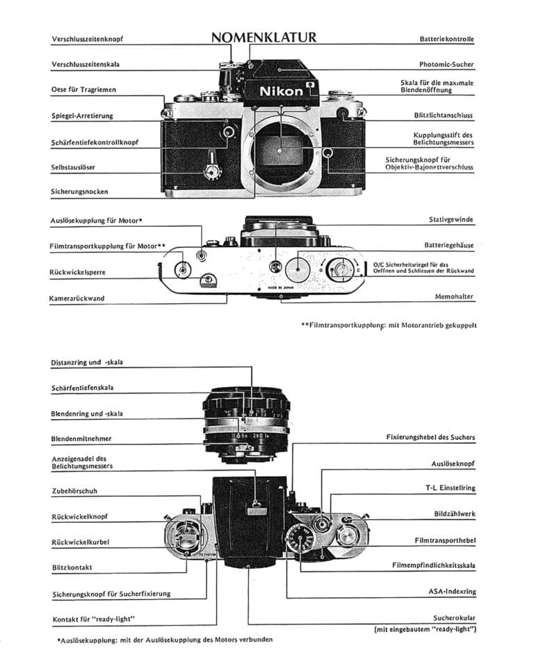 Legendäre einäugige Spiegelreflexkamera (1971) für den Kleinbildfilm 135 (Aufnahmeformat 24 x 36 mm) – eine der vielseitigsten klassischen Nikon-Spiegelreflexkameras. Dahinter steht ein riesiges System an über 100 Zubehörteilen, darunter alleine sechs verschiedenen Sucher: F 2 Photomic, F 2 S Photomic, Prismensucher, Sportprismensucher, Lichtschachtsucher und Lupensucher sechsfach. 19 verschiedene auswechselbare Mattscheiben standen zur Verfügung. Dazu etwa 40 Objektive mit Nikon-F-Bajonett vom Fischauge mit nur 6 mm bis zum Super-Tele mit 2.000 mm Brennweite.