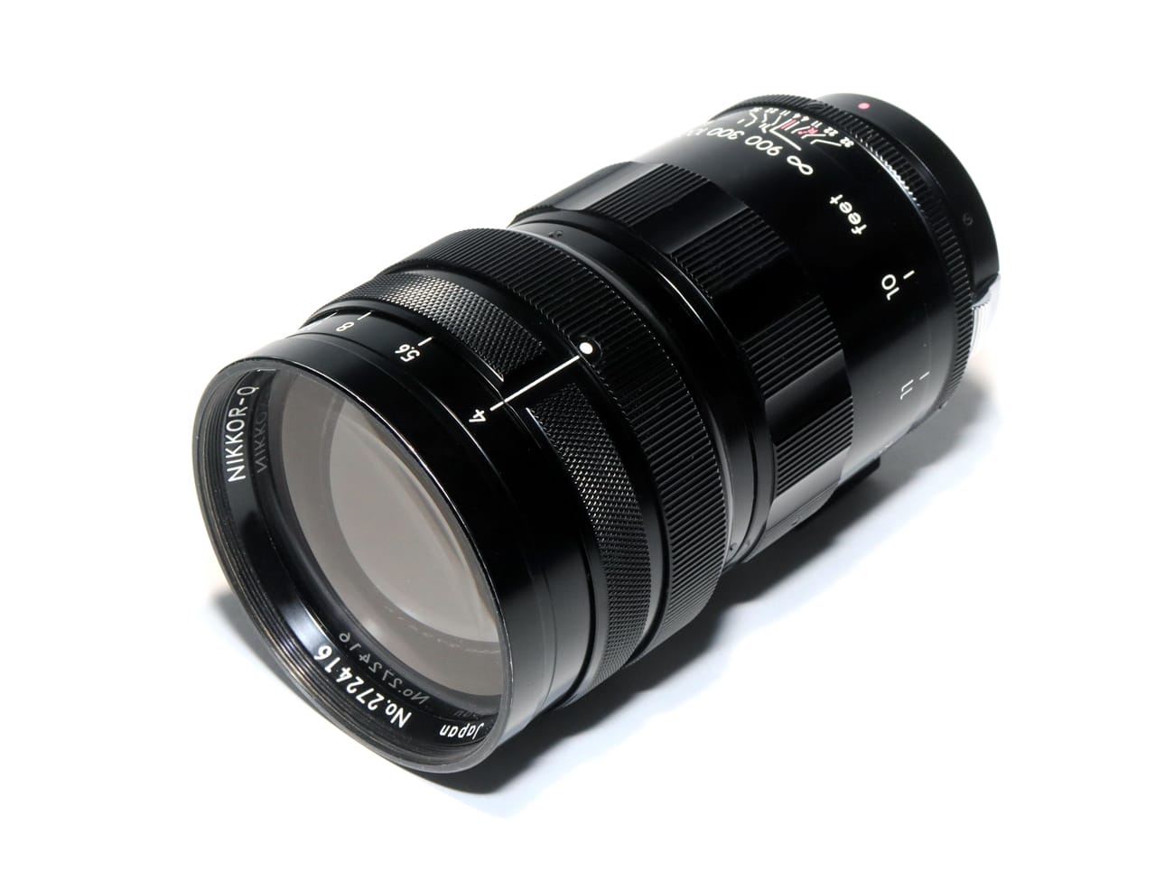 Ein massives, lichtstarkes Teleobjektiv für die Nikon-Messsucherkameras mit Contax-Nikon-S-Bajonett: Nikkor-Q 1:4/25 cm, einem (Code: „Q“) Vierlinser mit der Seriennummer 272416 (1958).
