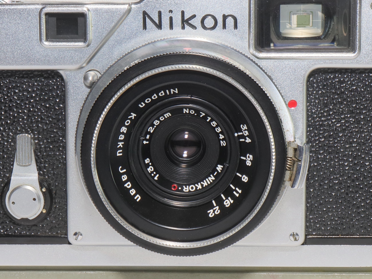 Gebaut zwischen 1958 bis 1960 in Japan in 12.310 Exemplaren. Die Nikon S 3 verwendet Kleinbildfilm 135 mit dem Aufnahmeformat 24 x 36 mm. Die Objektive haben den „Nikon S Mount“-Anschluss (entspricht fast dem klassischen Zeiss-Contax-Bajonett). Hier ist die S 3 bestückt mit dem Nikon W-Nikkor.C 1:3,5/2,8 cm von 1952, Seriennummer 715 342, abblendbar bis 22, gebaut in 10.000 Exemplaren. Hier mit einem Birnchenblitzgerät („Flash Unit BC-III“) und dem passenden Aufstecksucher („Viewfinder 2,8“).