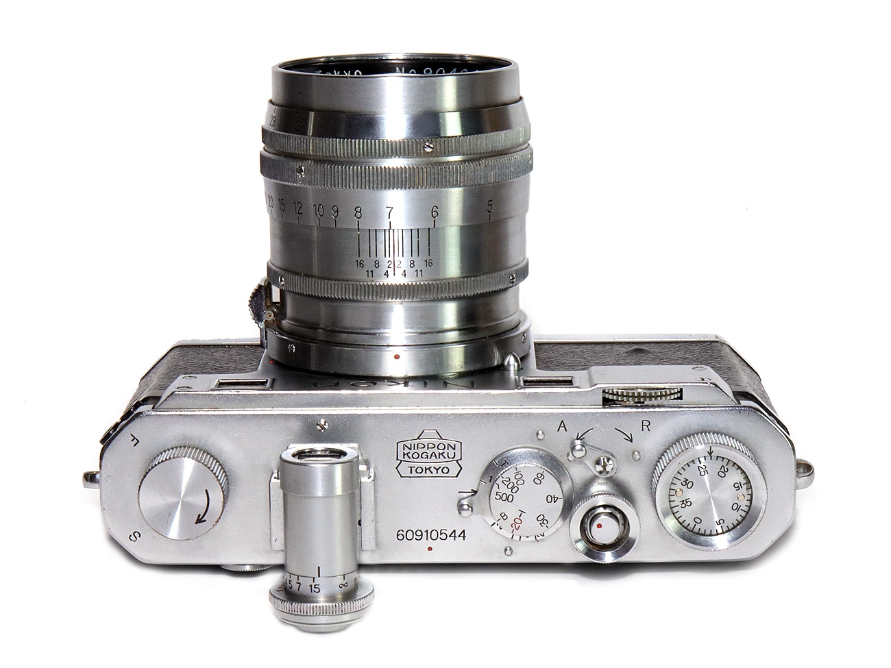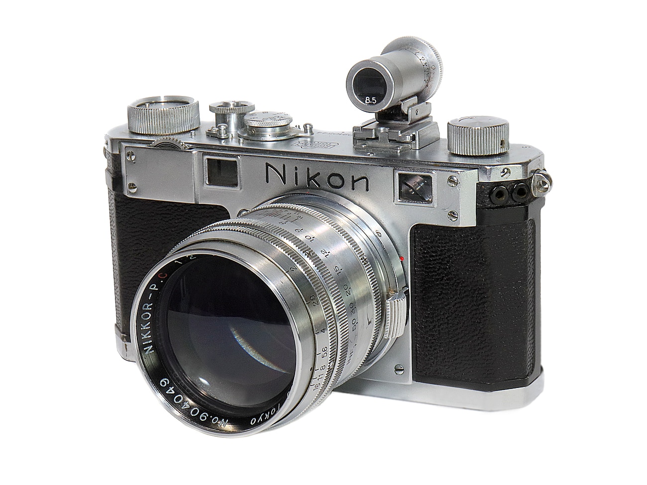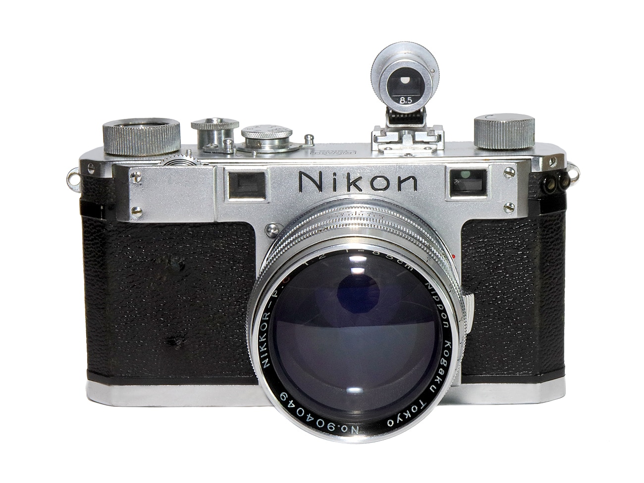 Frühe Messsucherkamera aus Japan (1951 bis 1955), hier mit ungewöhnlicher achtstelliger Seriennummer (60910544 – in Fachkreisen: „Eight-digit Type II), bestückt mit dem lichtstarken leichten Tele Nikkor-P.C 1:2,0/85 mm (Seriennummer 904049) mit Contax-Bajonett. Dazu – im Bild – ein Aufstecksucher („Viewfinder 8,5“). Filmtransport per Drehknopf (Kleinbildfilm Typ 135). Mechanischer Schlitzverschluss (T und B, 1 bis 1/500 Sekunde). Sucherrahmen für 50 mm, Suchervergrößerung: 0,6-fach.