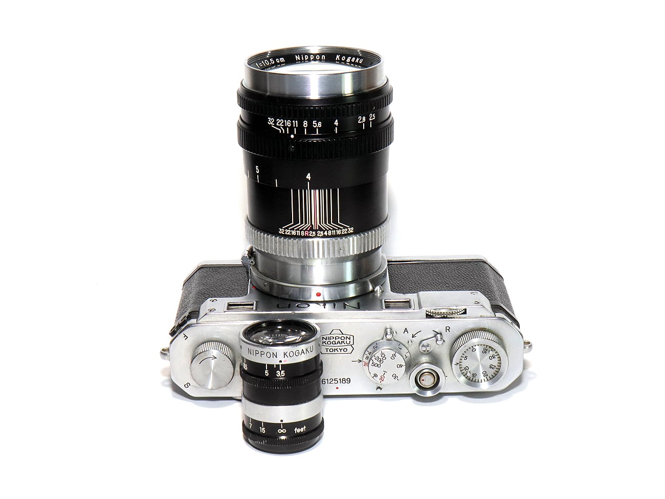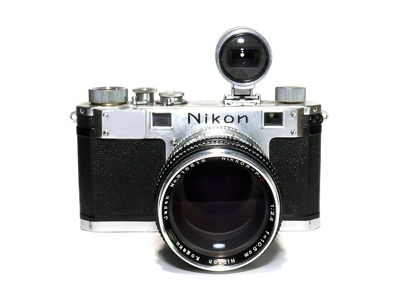 Frühe Messsucherkamera aus Japan (Seriennummer 6125189), hier bestückt mit dem schwarz lackierten Teleobjektiv Nikkor-P.C 1:2,5/10,5 cm (Seriennummer 915319) mit Contax-Bajonett. Dazu – im Bild – ein Aufstecksucher („Varifocal Type Ib Finder“, Seriennummer 358347). Es gab nämlich bei der Nikon S nur einen eingebauten Sucherrahmen für 50 mm.