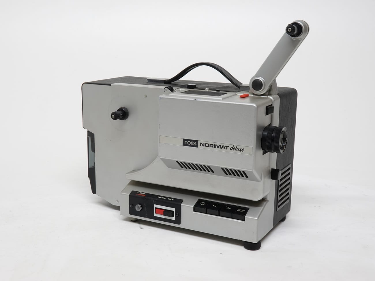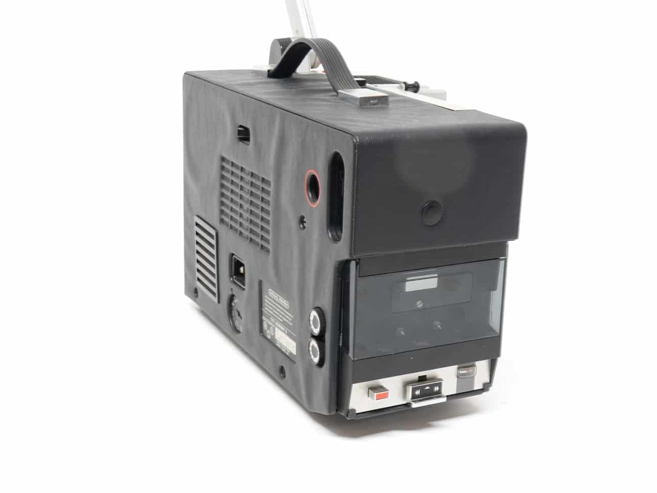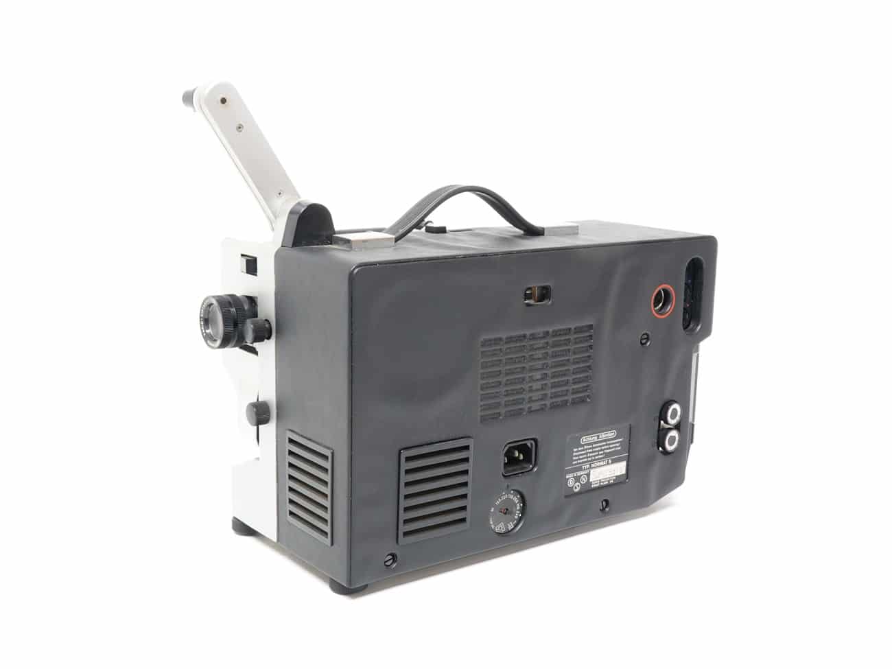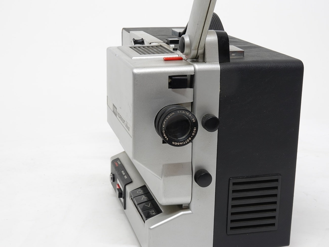 Super-8-Projektor, hergestellt ab 1974 in Westdeutschland. Als Besonderheit wird in der Bedienungsanleitung hervorgehoben, dass der Projektor „durch seinen organisch eingebauten Cassetten-Recorder Filmprojektor und Tonbandgerät in einem darstellt“. Objektiv: ISCO-Göttingen Vario-Kiptagon 1:1,3/16,5-30 mm. Halogen-Kaltlichtspiegellampe 12 Volt/100 Watt. Regietastatur für Vorlauf, sichtbaren Rücklauf, Stillstandsprojektion und Stopp. Filmschonender Rücklauf über Außenleitrolle direkt von Spule zu Spule. Tonteil: manuelle und automatische Aussteuerung. „Die Synchronität von Film und Ton wird dadurch garantiert, dass der Antrieb allein vom Projektormotor über eine gemeinsame Hauptwelle erfolgt.“ (Bedienungsanleitung, Seite. 32). Frequenzbereich 80 bis 10.000 Hertz.