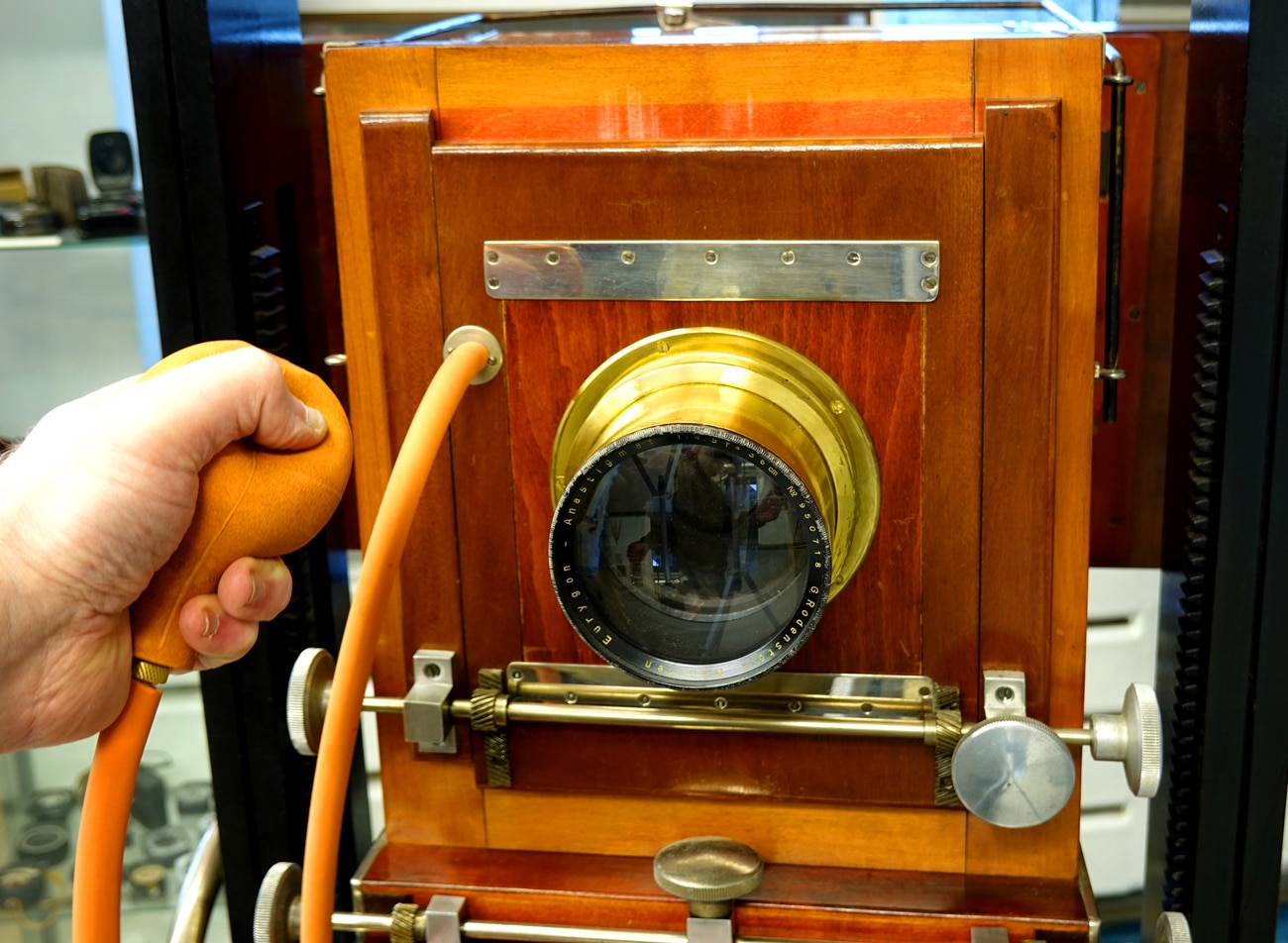 Mit dabei: das beliebte gelb-schwarze Kodak-Tuch, das die Fotografen damals über ihren Kopf und das Kamerarückteil stülpten, um die Mattscheibe gegen Fremdlicht zu schützen und so die Schärfe und die Bildkomposition besser beurteilen zu können.