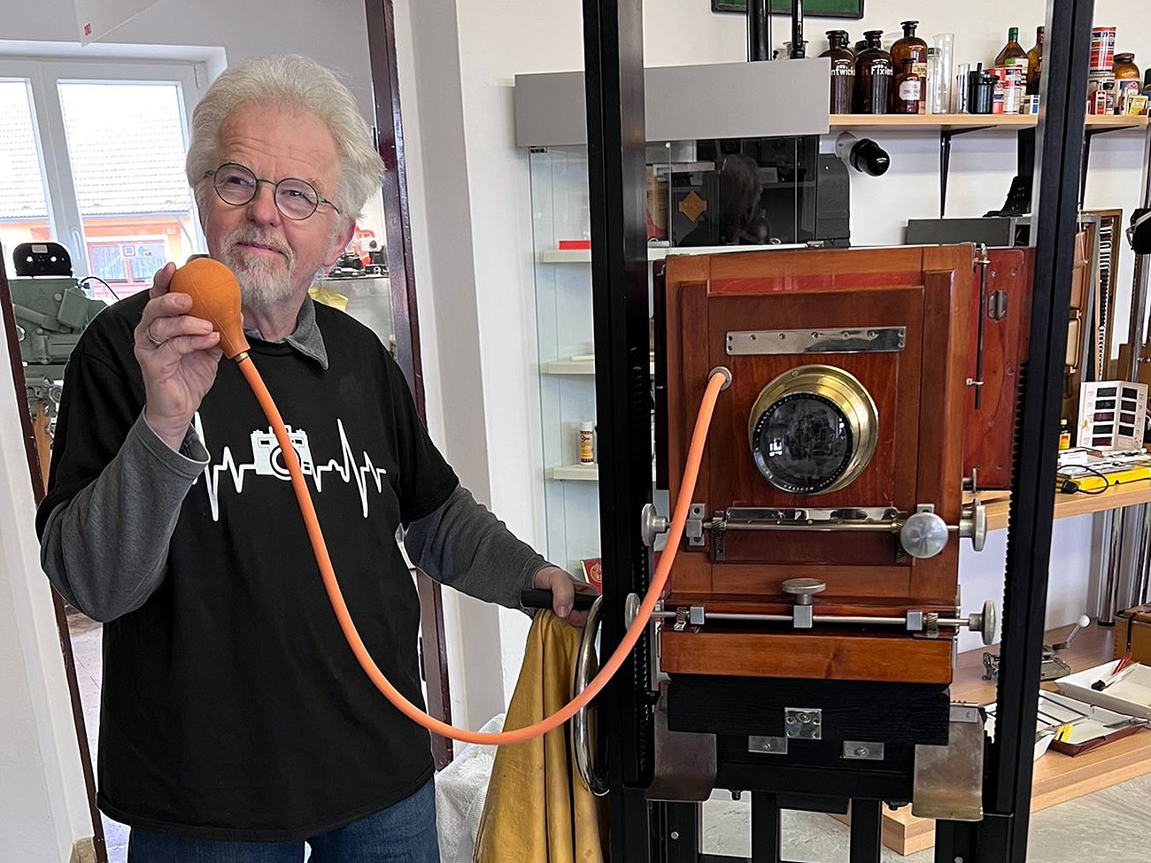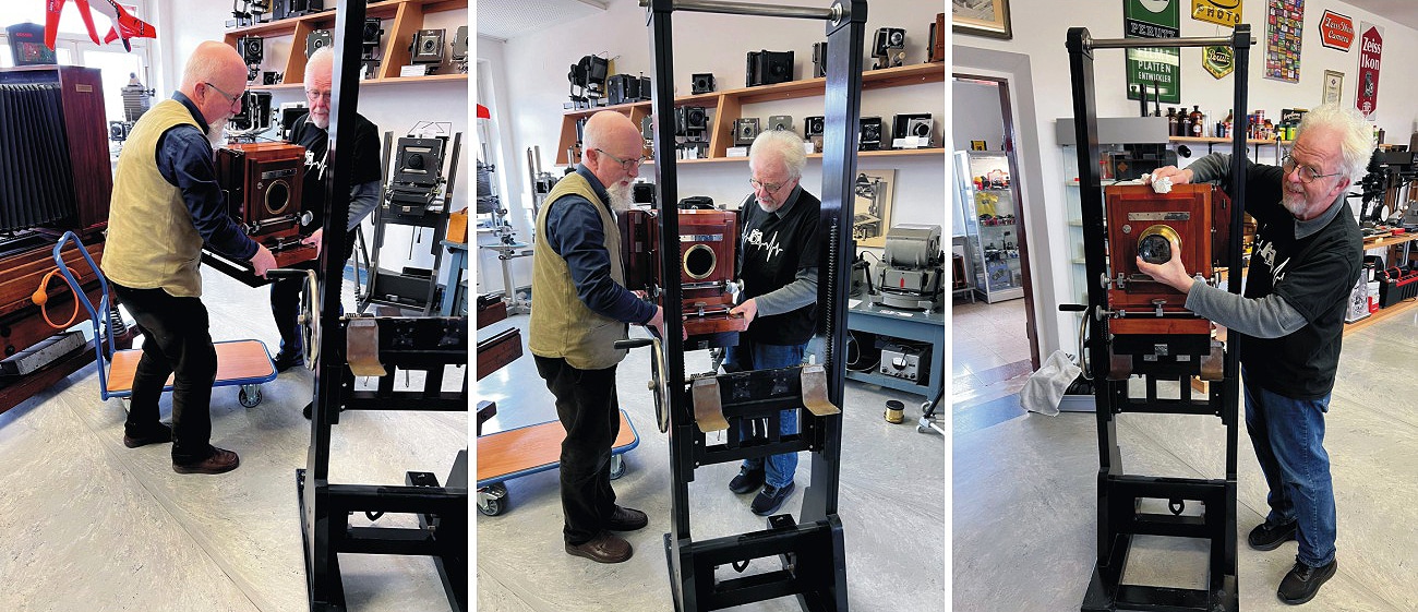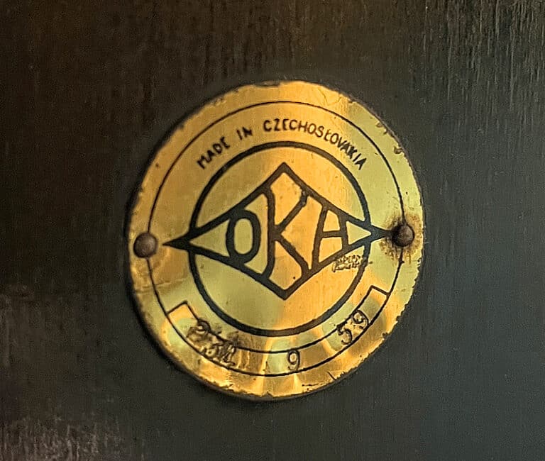 Ein Monstrum von Studiokamera aus der Tschechoslowakei: Ganze 2 Meter hoch ist der schwarz lackierte massive Stativrahmen, in dem die antike Plattenkamera höhenverstellbar montiert ist. Und damit übertrumpft die OKA – so jedenfalls der Name auf dem angenagelten Typenschildchen – unsere anderen Studiokameras um etliches. Das Museumsexemplar mit dem Negativformat 18 x 24 cm hat einen Hinterlinsenverschluss mit „Blasebalg“, montiert ist ein Messingobjektiv mit der Bezeichnung „G. Rodenstock München Eurygon-Anastigmat 1:4,5/36 cm No. 950718“. Über die Kamera und ihren Hersteller ist bislang wenig bekannt. Zu einer Marke OKA haben wir im ganzen WWW nichts gefunden. Auf der Plakette befinden sich zwei lesbare Zahlen: „9“ und „59“, was möglicherweise auch auf ein Produktionsdatum „September 1959“ hindeuten könnte, zumal auch in der damaligen DDR Großformatkameras dieser Bauart bis in die 1970er Jahre hinein gebaut wurden.
