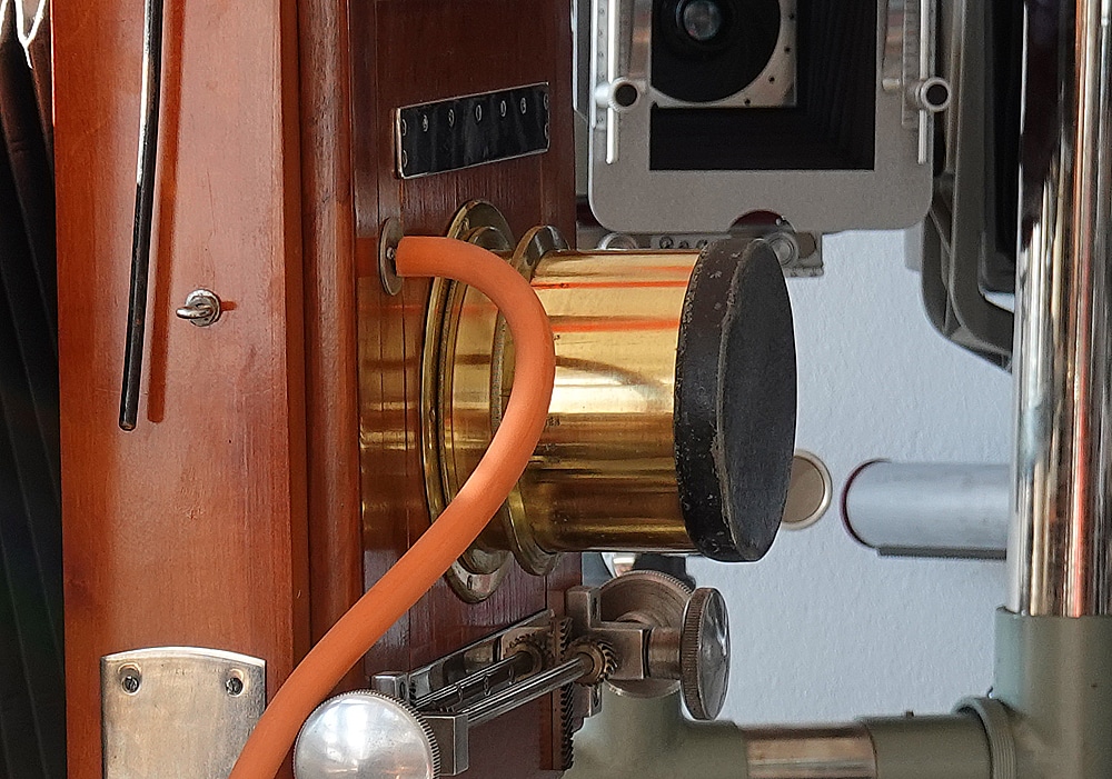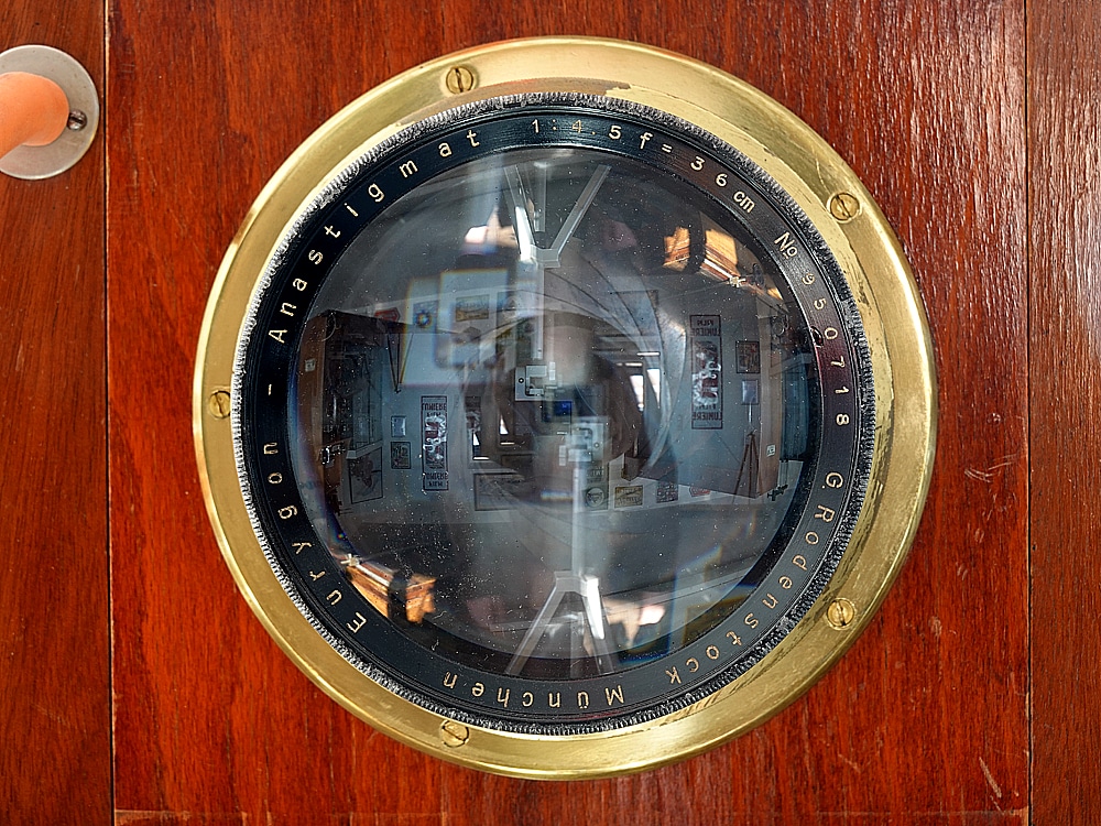 Ein Monstrum von Studiokamera aus der Tschechoslowakei: Ganze 2 Meter hoch ist der schwarz lackierte massive Stativrahmen, in dem die antike Plattenkamera höhenverstellbar montiert ist. Und damit übertrumpft die OKA – so jedenfalls der Name auf dem angenagelten Typenschildchen – unsere anderen Studiokameras um etliches. Das Museumsexemplar mit dem Negativformat 18 x 24 cm hat einen Hinterlinsenverschluss mit „Blasebalg“, montiert ist ein Messingobjektiv mit der Bezeichnung „G. Rodenstock München Eurygon-Anastigmat 1:4,5/36 cm No. 950718“. Der Seriennummer nach dürfte es sich um eines der letzten Objektive der „Vorkriegs“-Serie (Ausführung in Messing) aus dem Jahr 1940 handeln, denn nach 1945 machte Rodenstock mit schwarz lackierten Objektiven ab der Seriennummer 2.000.000 weiter.