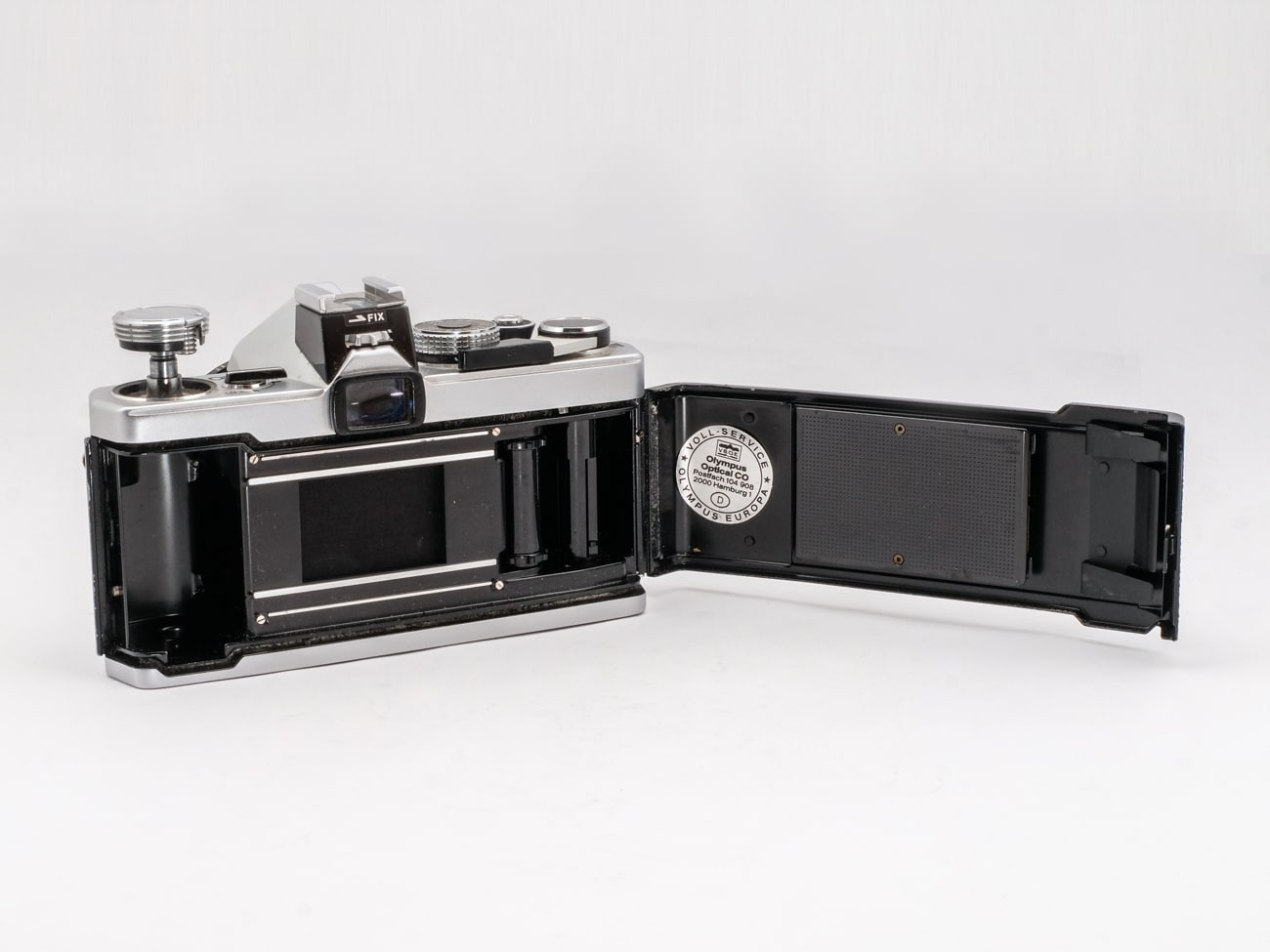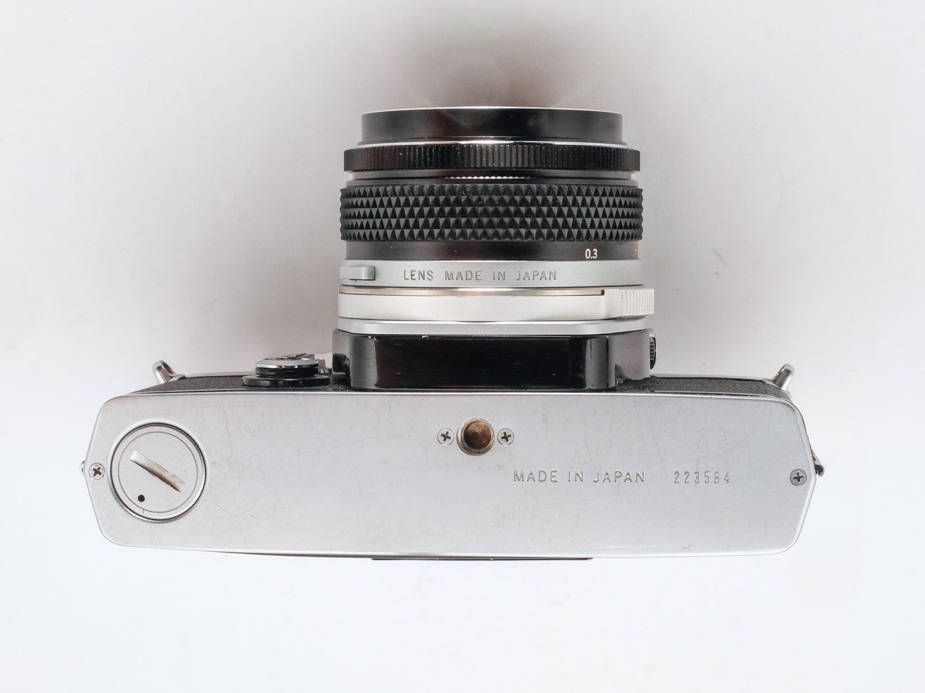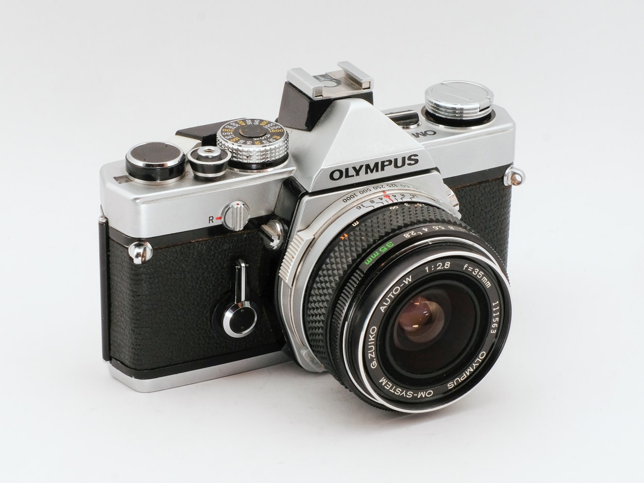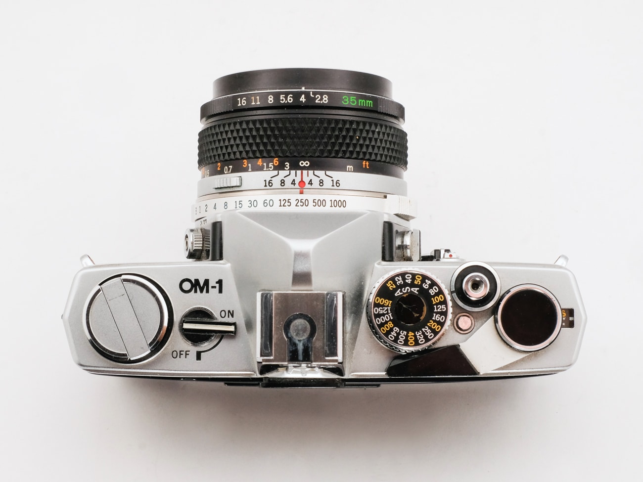 Einäugige Spiegelreflexkamera (SLR) für den Kleinbildfilm 135 (Aufnahmeformat 24 x 36 mm), hergestellt von 1972 bis 1979 in Japan. Für Wechselobjektive mit Olympus OM-Bajonett, hier mit G. Zuiko Auto-W 1:2,8/35 mm, Seriennummer 111563; manuelle Fokussierung. Großfeld-Prismensucher; Suchermattscheibe mit Mikroprismenfeld; 12 auswechselbare Einstellscheiben. Mechanischer Schlitzverschluss (B, 1 bis 1/1.000 Sekunde; mechanischer Selbstauslöser mit eigenem Auslöser, Vorlaufzeit zwischen 4 und 12 Sekunden variabel). Mittenbetonte CdS-Belichtungsmessung durch das Objektiv (TTL); manuelle Belichtungssteuerung, Nachführzeiger mit Plus-/Minus-Index im Sucher; Ein-/Ausschalter für Belichtungsmesser. Spiegel separat hochklappbar. Blitzsynchronisation: X und FP, umschaltbar auf beide Kontakte. Filmempfindlichkeitsbereich 15 bis 33 DIN (ASA 25 bis1.600). Anschlüsse für Drahtauslöser und Stativ (1/4″). Im Unterschied zur Olympus OM-1 MD ist hier keine Möglichkeit zur Verwendung eines Motors oder Winders vorhanden, eine Umrüstung wurde allerdings angeboten. Bei einigen Ausführungen, wie hier, war an der Rückwand ein Rahmen zum Befestigen eines Filmpackungsabschnitts angebracht. Um Grauimporten entgegenzuwirken, brachte Olympus an der Innenseite der Rückwand einen Aufkleber „VSOE“ an. Stromversorgung: 1 x Batterie RM 625 R.