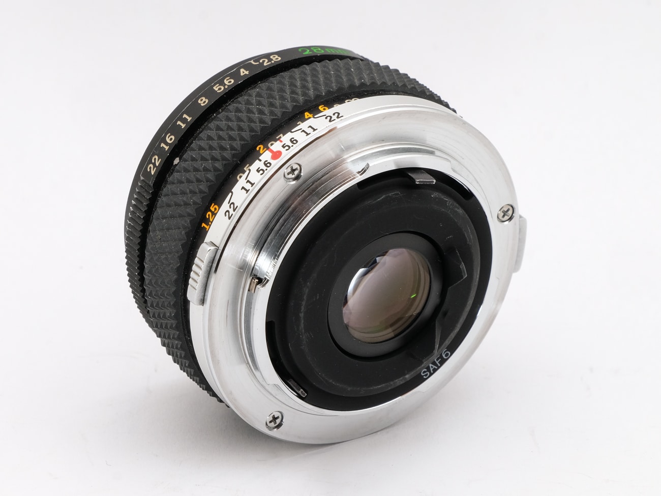 Weitwinkelobjektiv für das Olympus-OM-Bajonett. Der Anwendungsbereich ist bei Olympus in der Typenbezeichnung durch Buchstaben gekennzeichnet: „W“ für Weitwinkel, „T“ für Tele, „S“ für Standard. Die Beschriftung der Objektive wurde teilweise während der Produktionsperiode geändert, obwohl keinerlei technische Änderungen vorlagen. Beispielsweise wurde „MC“ für Multicoating entfernt, da ohnehin alle Objektive vergütet waren. Zusätzlich zu den Seriennummern hat Olympus die Objektive mit einem Produktionscode versehen, der ab 1981 vierstellig war: Die ersten beiden Buchstaben kennzeichnen das Produktionswerk, der dritte Buchstabe das Jahr, beginnend mit A für 1981, die Zahl an vierter Stelle den Monat. Der hier vorliegende Code „SAF6“ bedeutet danach: Produktionswerk Sakaki, Jahr 1986, Monat Juni. Der Code ist auf dem schwarzen Ring an der Fassung der Hinterlinse aufgedruckt. Dieses Objektiv, eine Retrokonstruktion, hat einen diagonalen Bildwinkel von 75°, enthält 6 Linsen in 6 Gruppen bei einem Blendenbereich von 2,8 bis 22 (Automatikblende). Die kürzeste Aufnahmeentfernung beträgt 0,3 Meter, Filtergewinde: 49 mm. Seriennummer: 361784.