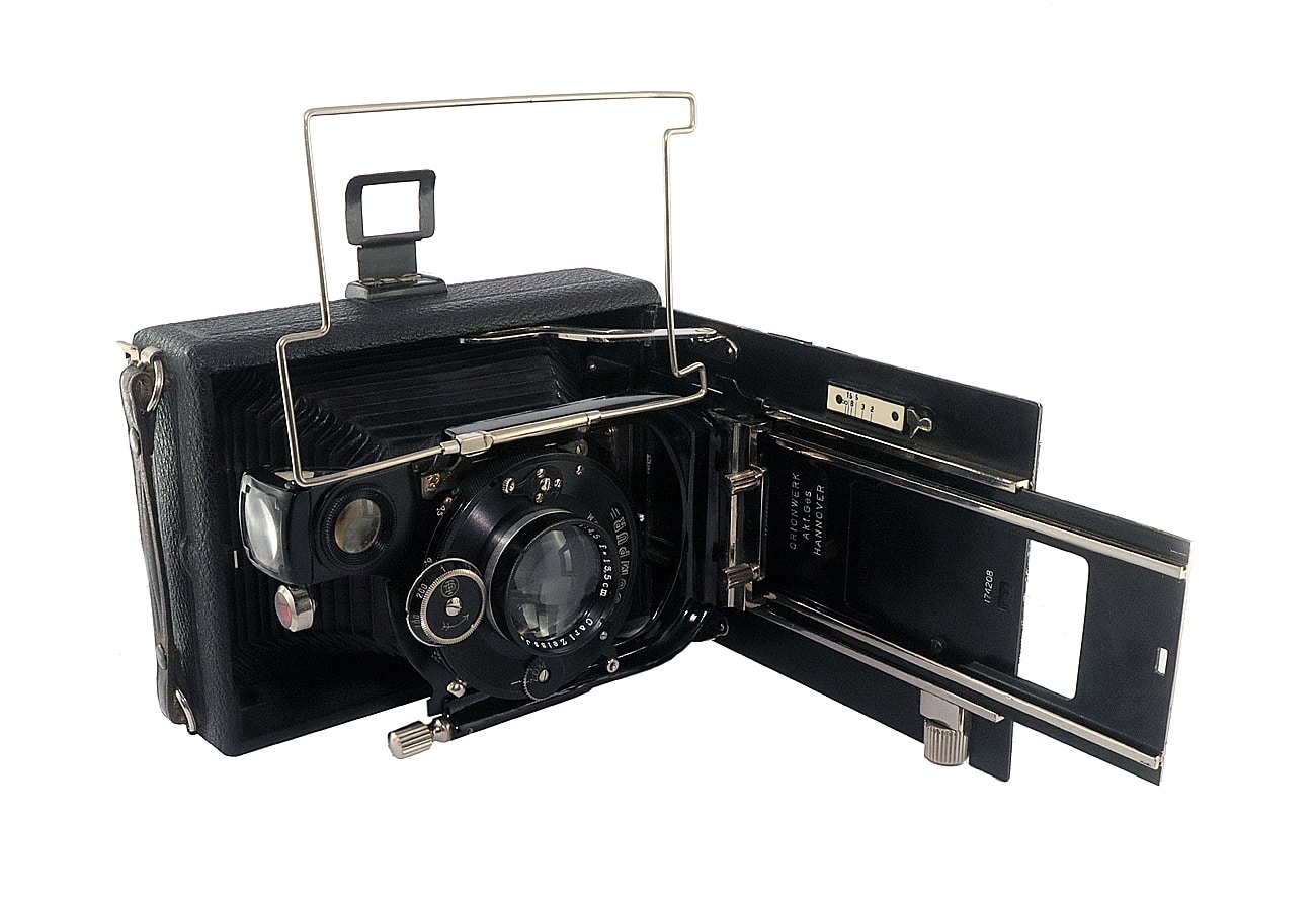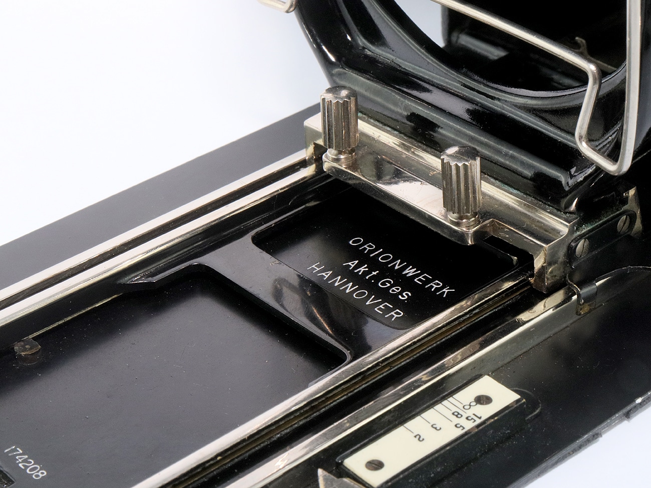 Dass diese stattliche Plattenkamera im Aufnahmeformat 9 x 12 cm aus dem „ORIONWERK Akt. Ges. Hannover“ stammt, ist unstrittig: So steht es im Laufboden eingraviert. Aber der genaue Kameratyp gibt noch Rätsel auf. Am ähnlichsten sieht das Gerät der Orion Rio 21 C, jedenfalls wenn man die Spreizen und die Aufhängung des Tragegriffs sowie die Konstruktion des doppelten Auszugs betrachtet. Das C steht bei den Orion-Kameras der Rio-Baureihe (die sicher mehr als ein Dutzend Modelle umfasst) übrigens immer für das Format 9 x 12 cm. Es gab auch Kameras für kleinere und größere Formate. Gebaut worden ist diese Rio vermutlich Anfang der 1920er Jahre. Sie trägt die Seriennummer 174208.