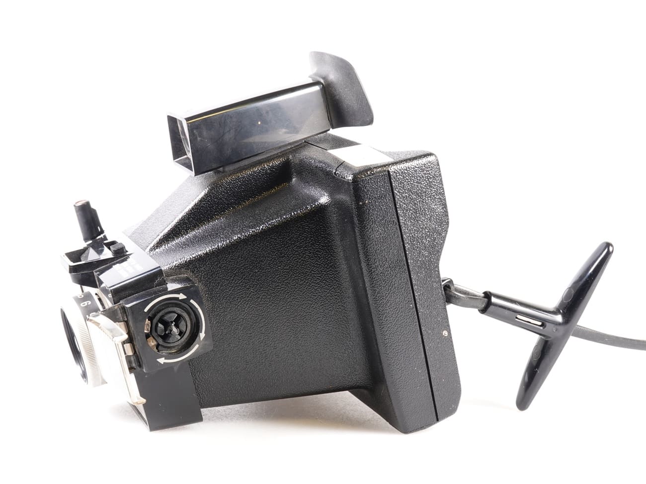 Sofortbildkamera für Filmkassetten Typ 107 oder 108. Objektiv: ohne Bezeichnung, manuelle Fokussierung. Fernrohrsucher. Automatische Belichtungssteuerung, manuell korrigierbar. Anschluss für Blitzwürfel, mit Streuscheibe. Handschlaufe mit Griff zum Festhalten der Kamera beim Herausziehen des belichteten Bildes. Mit Kälteschutzmappe Polaroid Cold-Clip 195 X.