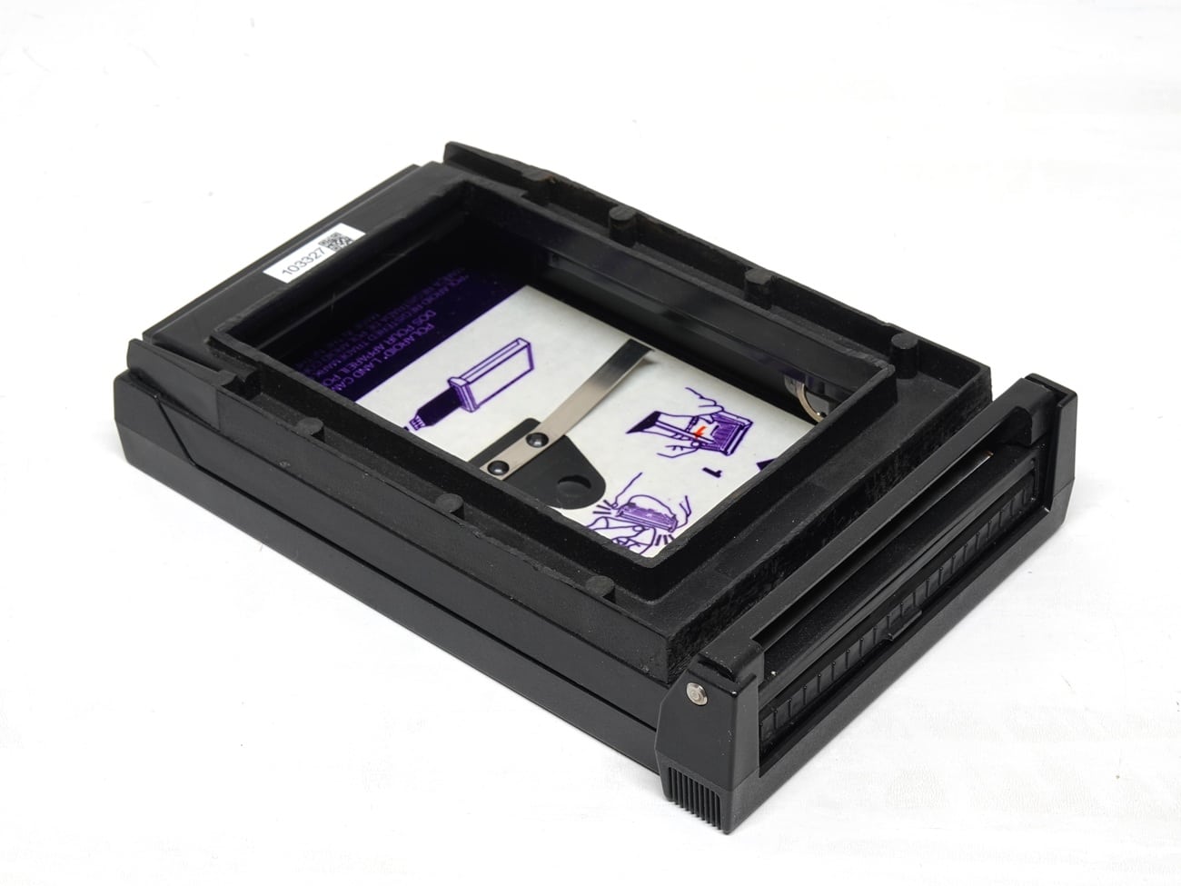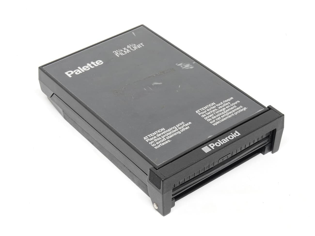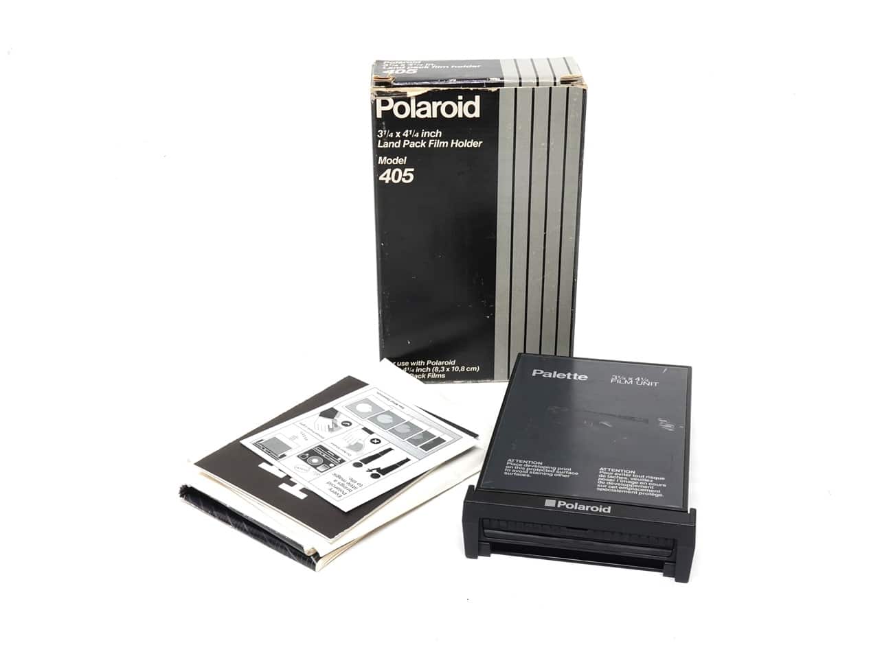Polaroid-Adapter für Plattenkameras: „For use with Polaroid 3 1/4 x 4 1/4 inch (8,3 x 10,8 cm) Instant Pack Films“. Die Polaroid Land Packfilmkassette erlaubt die Verwendung von Polaroid Land Packfilm an fast allen Kameras mit Standard 4 x 5-Mattscheiben oder -Sucherkameras. Sie passt ebenso an Geräte wie Bildschirmkameras und andere Instrumente, die mit ähnlichen 4 x 5-Rückteilen ausgerüstet sind. Es ist nicht erforderlich, die Kamera oder die Schärfeebene zu verändern. Es werden Polaroidfilme der Typen 100, 669, 667, 664, 665 oder Fuji Sofortbildmaterial 100 verwendet. Im Museum in Originalverpackung.