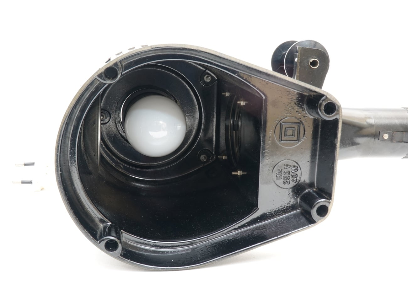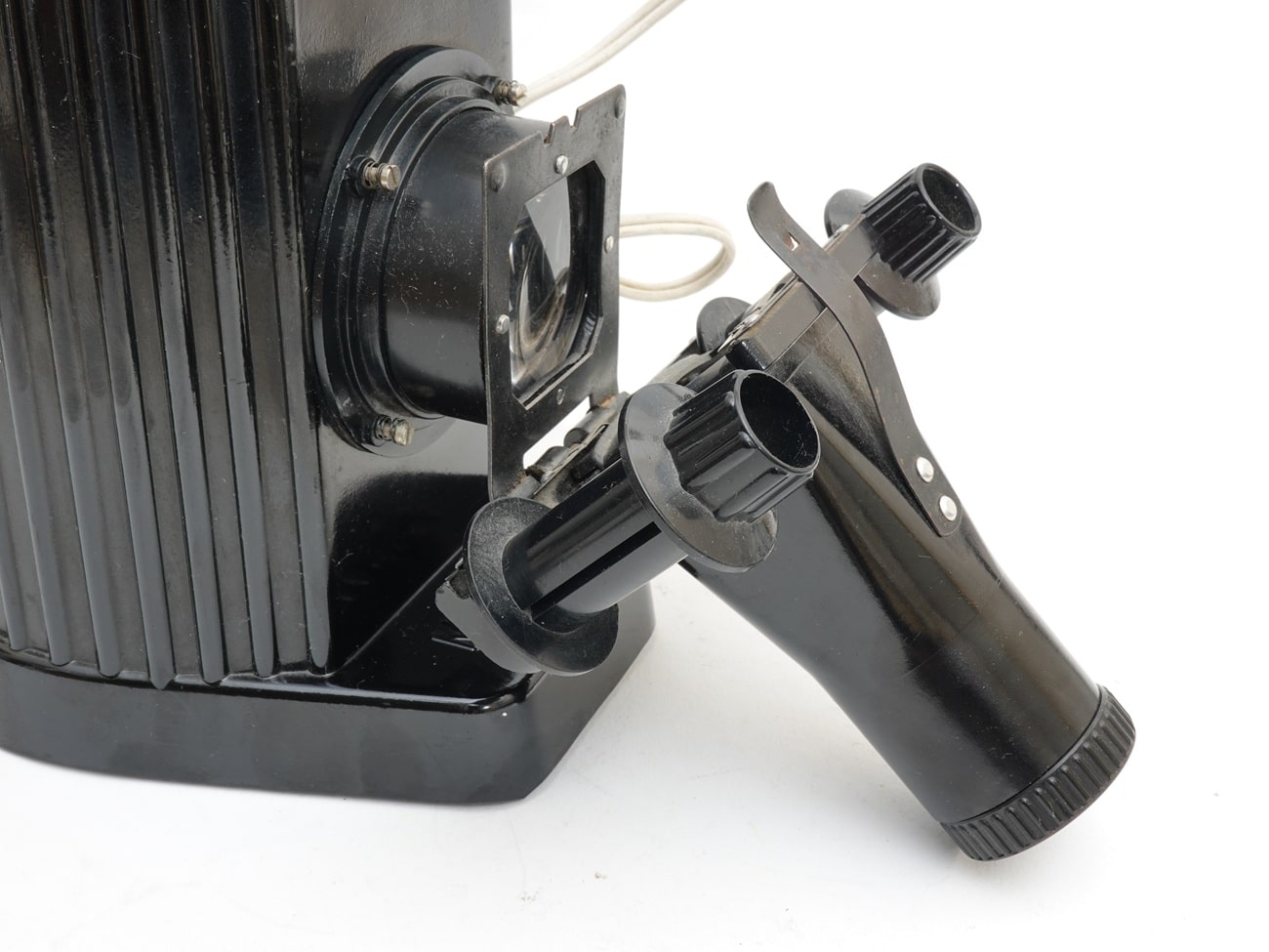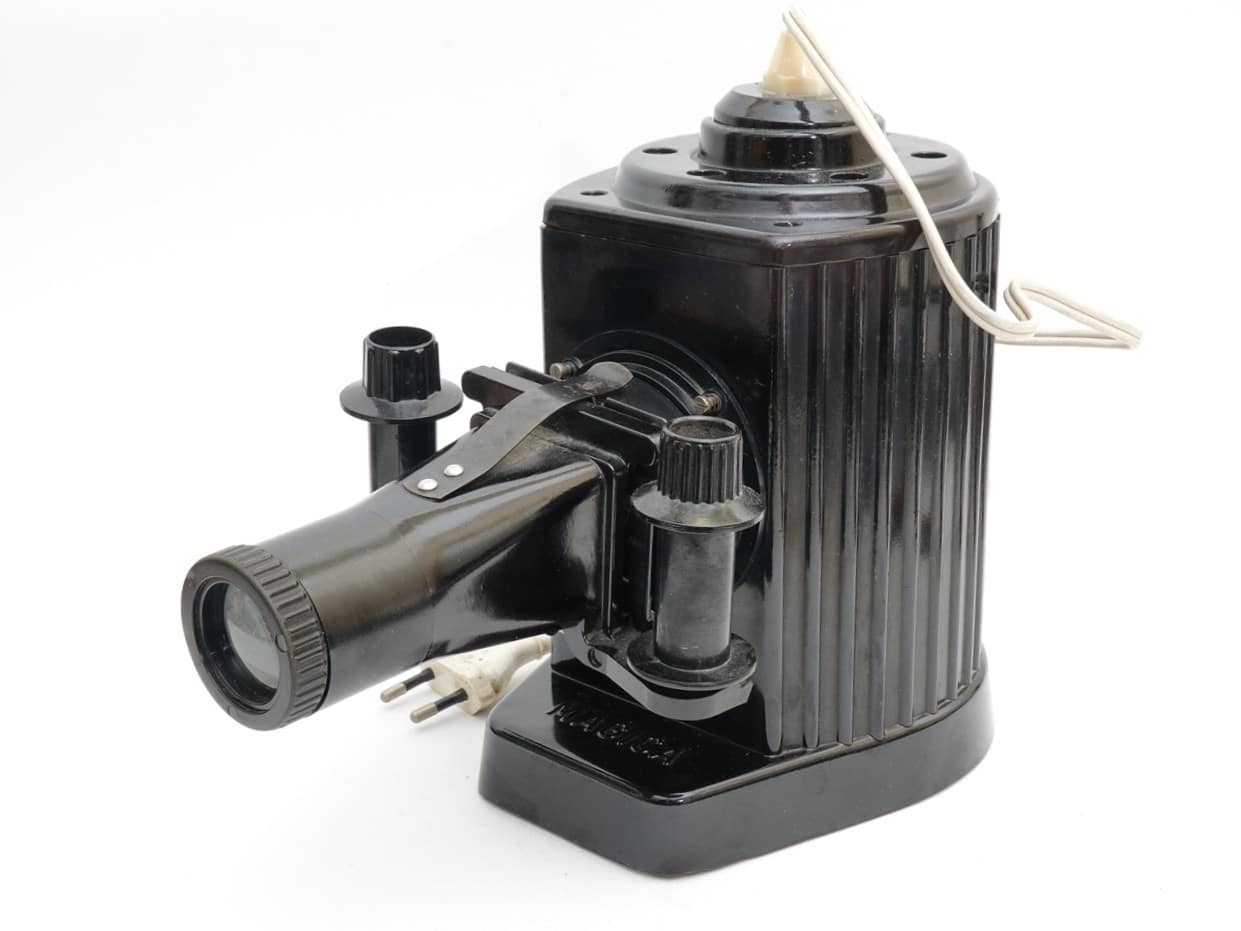 Einfacher Projektor für Bildbänder im Kleinbildformat, hergestellt in der DDR in den 1950er Jahren. Manuelle Fokussierung durch Verschieben des Objektivtubus. Lampenfassung E 27, hier bestückt mit einer Glühlampe Osram Superlux Krypton 230 Volt/35 Watt; Netzanschluss. Zur Ableitung der Wärme dienen Lüftungslöcher im Bakelitgehäuse; die außenliegenden Kühlrippen sind eher angedeutet.