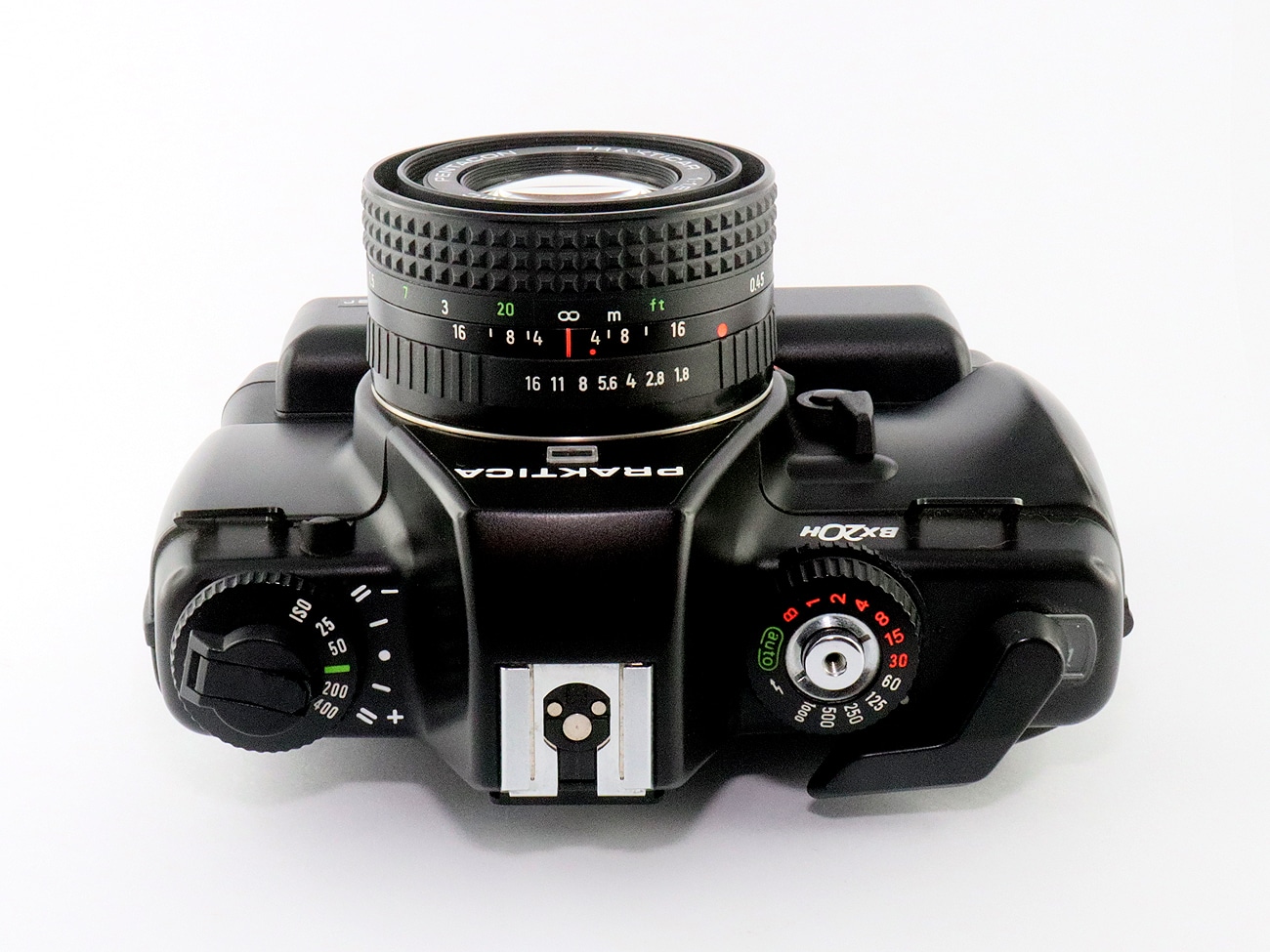 Stufenlos arbeitender, elektronisch gesteuerter Vertikalverschluss mit Lamellen aus Metall. Fest eingebautes Pentaprisma, im Sucher über 16 LEDs angezeigte Verschlusszeiten auf der rechten Seite des Sucherbilds, unten eingespiegelte Blendenwerte der Objektive mit Praktica-B-Bajonett (elektronische Steuerung). Das begrenzte Negativformat ist im Sucher durch dünne Linien markiert. Normalobjektiv: Pentacon Praktica MC 1:1,8/50 mm.
