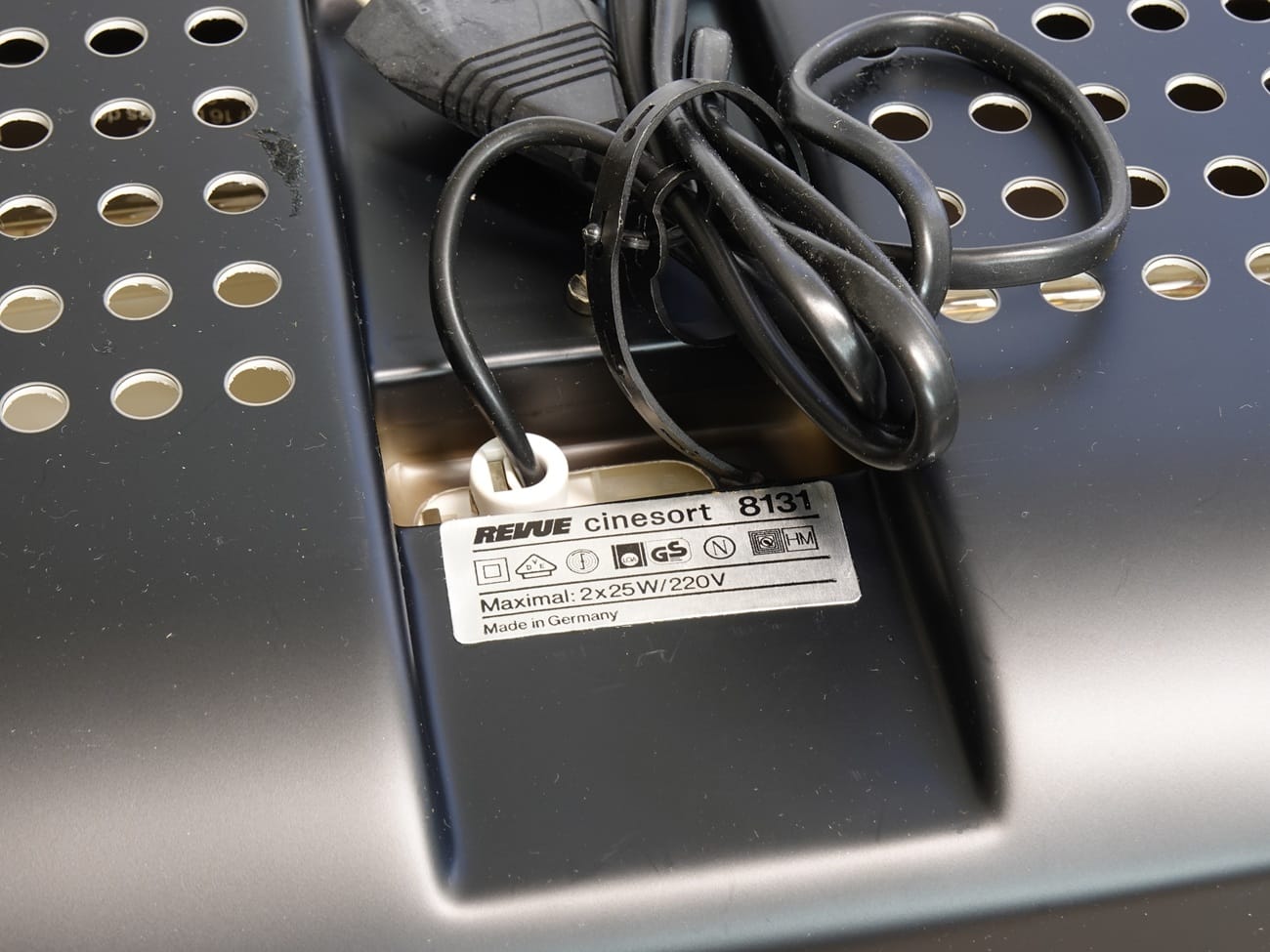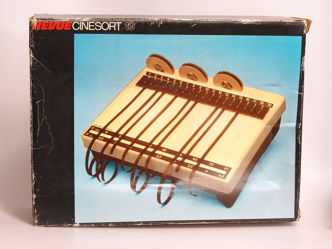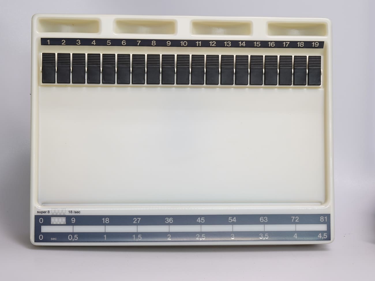 Typisches Sortierpult (Filmsortierer) für den Schmalfilmamateur, hergestellt um 1980 in Deutschland. 19 Plätze mit Klammern; oben Halterungen für die 15-m-Spulen, wie sie aus der Entwicklungsanstalt kommen, unten Skalen für Bildzahlen und Szenenlängen bei Super-8-Filmen und der Normalfrequenz von 18 Bildern pro Sekunde. Hintergrundbeleuchtung (2 x 25 Watt) mit Netzkabel; Aufsteller auf der Rückseite. Im Museum im Originalkarton.