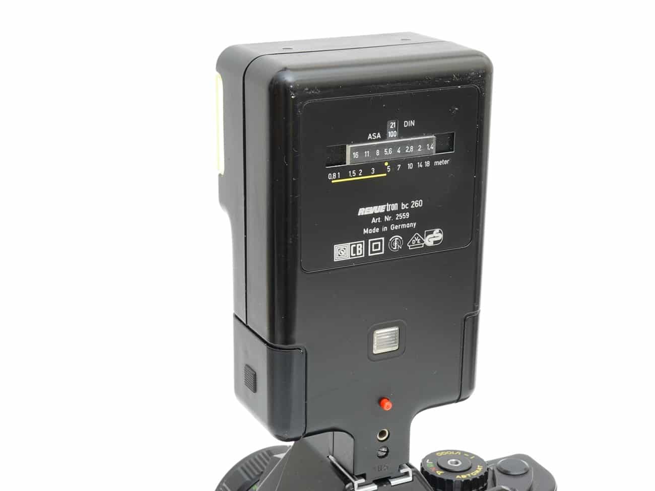 Computergesteuertes Elektronenblitzgerät für den Amateurbereich, hergestellt in den 1980er Jahren in Deutschland und vertrieben von Foto Quelle unter der Handelsmarke Revue. Leitzahl vermutlich 26 bei 100 ASA/21 DIN; starrer Reflektor. Stromversorgung: 4 x Batterien AA (1,5 Volt).