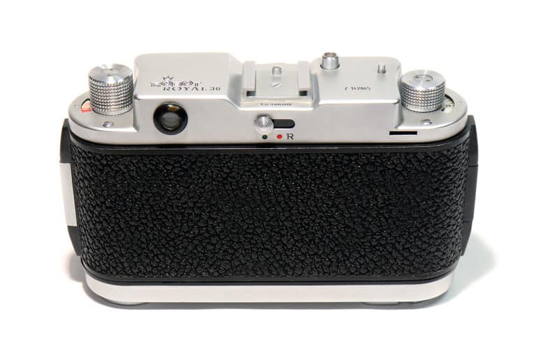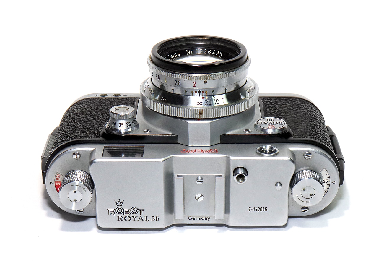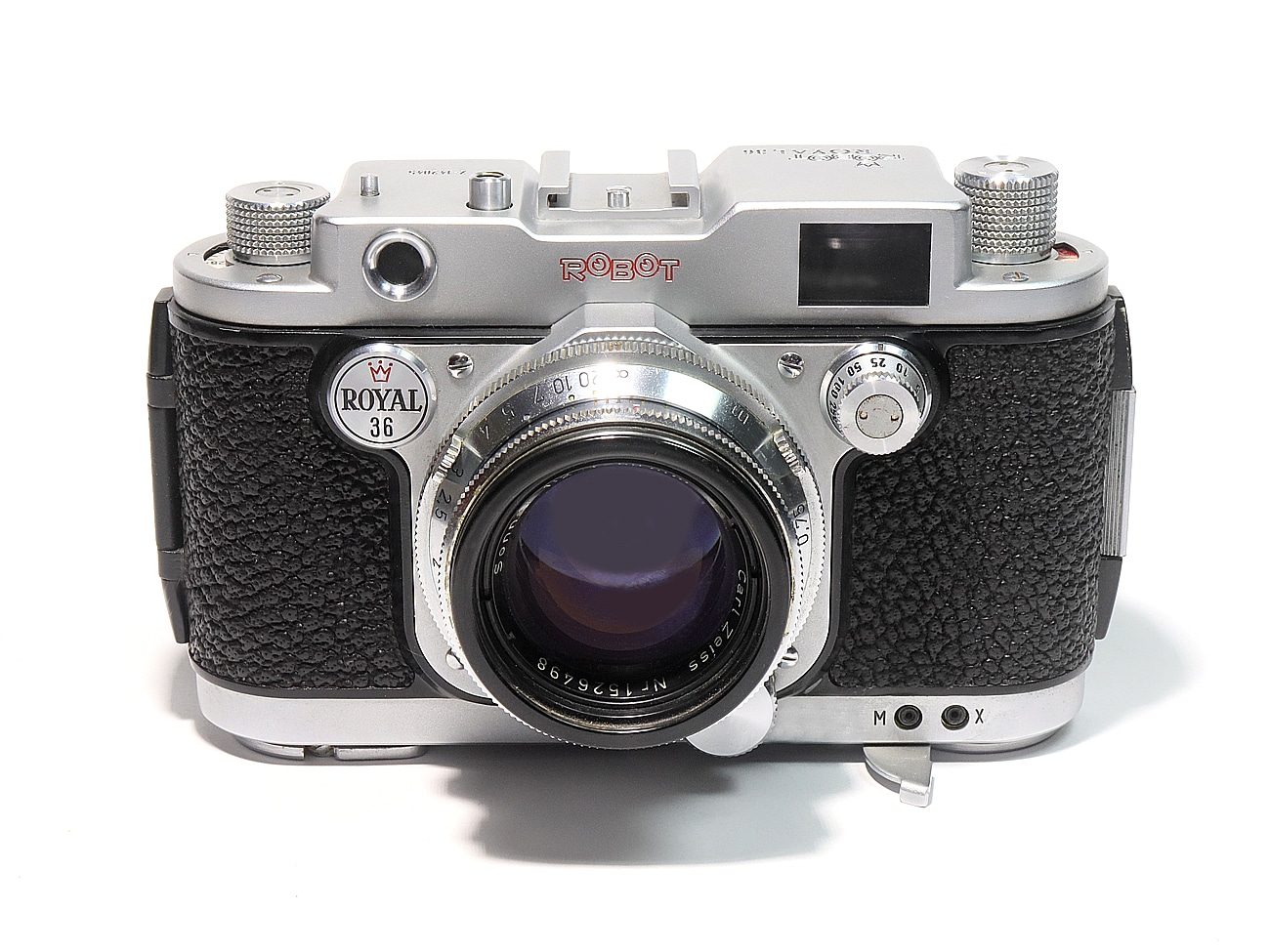 Ende des Jahres 1955 kam die Robot Royal 36 heraus, mit dem für die Firma Robot ungewöhnlichen Aufnahmeformat 24 x 36 mm. Die Royal 36 übernahm alle Merkmale der bewährten Robot-Präzision: den eingebauten gekuppelten Entfernungsmesser, den unverwüstlichen Rotorverschluss mit Belichtungszeiten von 1/2 bis 1/500 Sekunde und die Möglichkeit, Elektronenblitzgeräte mit allen Verschlusszeiten bis zu 1/500 Sekunde zu synchronisieren. Robot-Bajonett (hier mit dem sehr seltenen Objektiv Carl Zeiss Sonnar 1:2/50 mm, Seriennummer 1526498), einem Sechslinser.