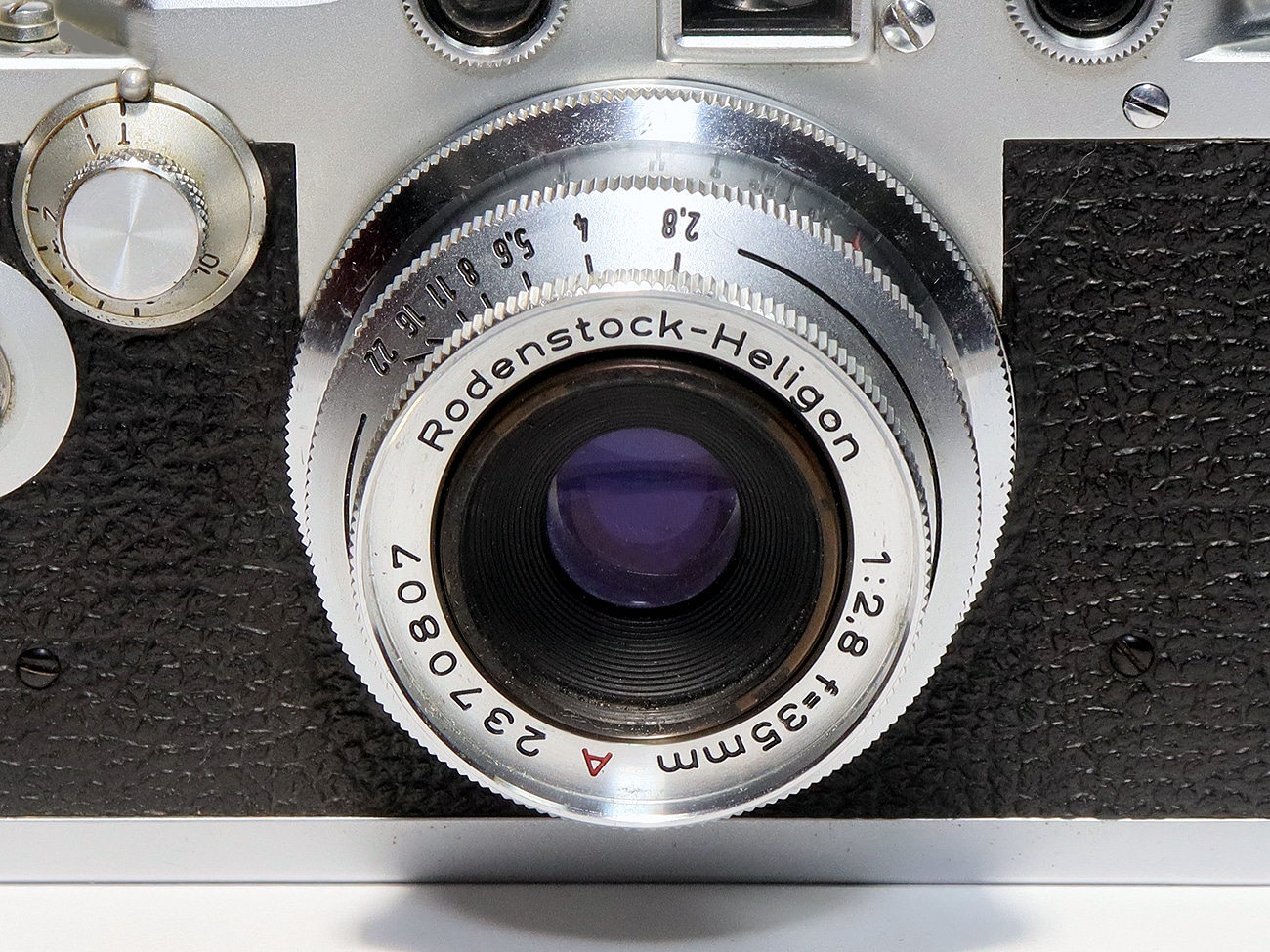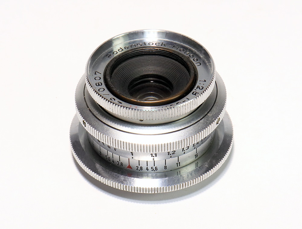 Ein damals wie heute sehr seltenes Objektiv, das uns da an einer (Schraub-)Leica IIIf erreichte: ein Rodenstock-Heligon 1:2,8/35 mm A, etwa Anfang der 1950er Jahre gebaut. Massives, verchromtes Kupfergehäuse, Doppel-Gauss-Konstruktion (6 Linsen in 4 Gruppen), Rastblende, kürzeste Entfernungseinstellung: etwa 0,9 Meter, Aufsteckblende A 36. Es gab auch ein M-39-Objektiv mit Vorwahlblende. In den 2010er bis 2020er Jahren wurde dieses Objektiv mit 700 bis 1.000 Euro gehandelt.