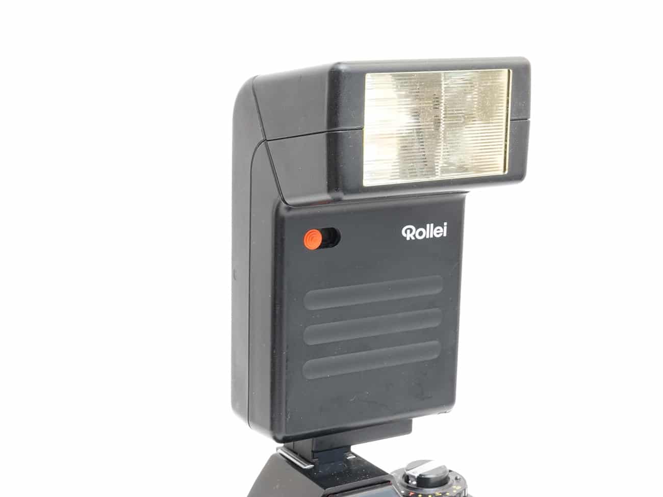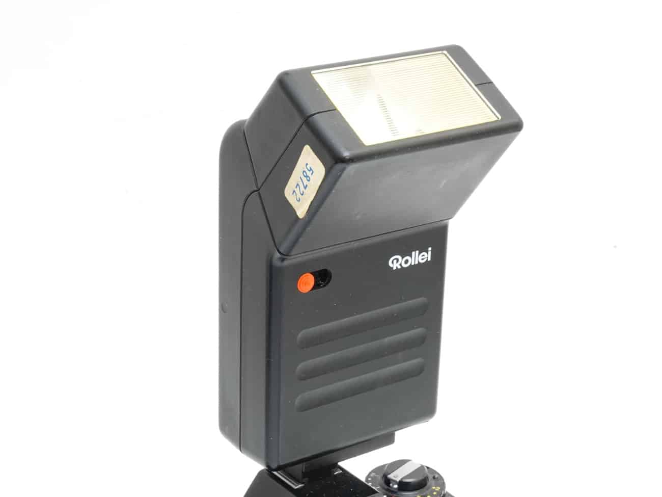Computerblitzgerät als Aufsteckblitz, hergestellt in den 1980er Jahren bei Rollei in Singapur. Durch Drehung verstellbarer Reflektor. Leitzahl 34 bei 100 ASA/21 DIN. Stromversorgung: 4 x Batterien 1,5 Volt (AA/LR 6) oder vier entsprechende NC-Akkus, die im Blitzgerät geladen werden können. Synchronisation über Mittenkontakt oder Kabel. Anschluss für Stativ (1/4″-Gewinde).