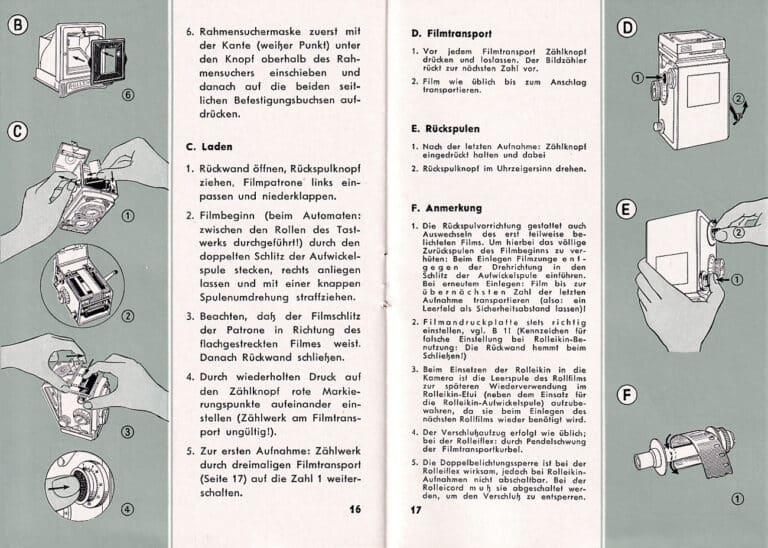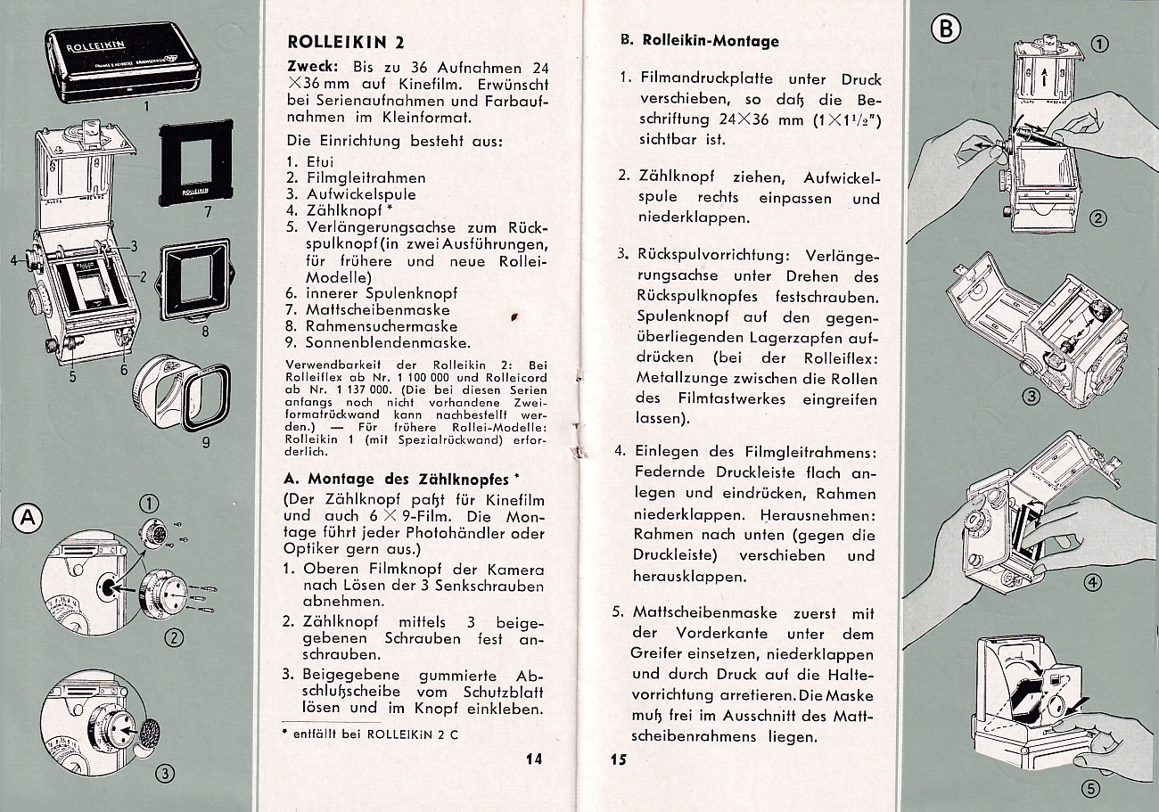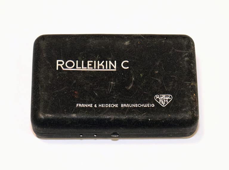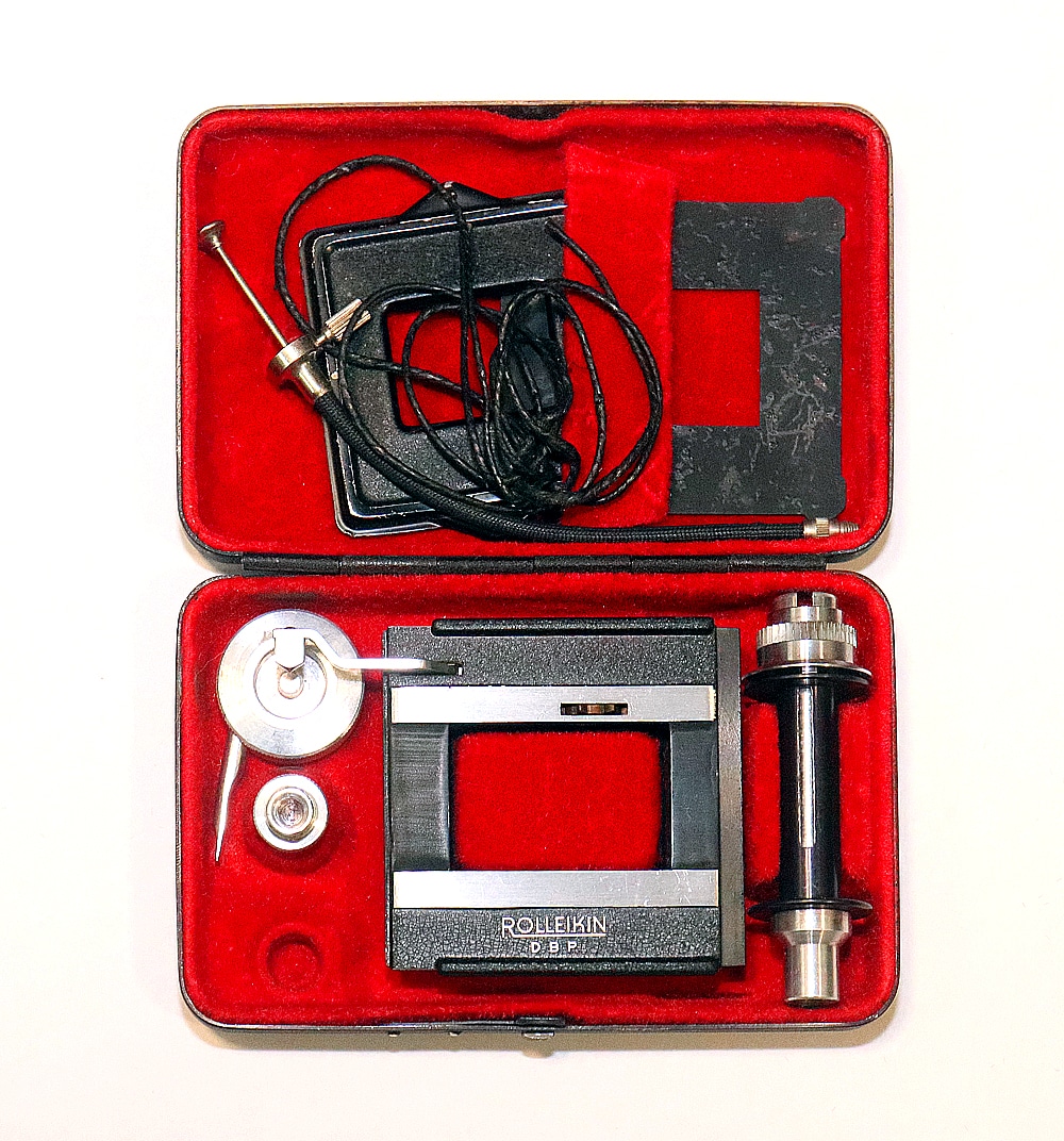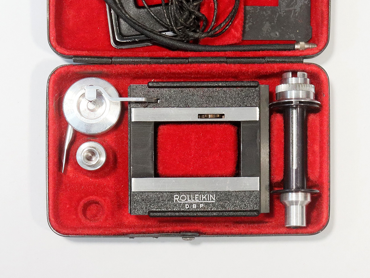 Damit werden einige Rolleiflex-6 x 6-Rollfilmkameras zu Kleinbildkameras: Der Rollei Rolleikin C ist ein Adapter, mit dem bestimmte Rolleiflex TLR-Kameras 35-mm-Film verwenden können, wodurch sich eine größere Filmvielfalt realisieren lässt. Der Rolleikin C ist für die Rolleiflex-Modelle 2.8 bis 2.8 E konzipiert, jedoch nicht für die Modelle E 2 und E 3. In diesem Originaletui scheinen Kleinteile zu fehlen.