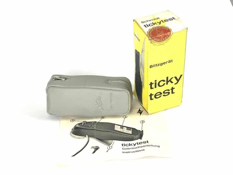 Birnenblitz mit entfaltbarem Fächerreflektor, 1960er Jahre. Hersteller: Wilhelm Schmidt KG, Calw. Synchronisation über X-Kontakt (Kabel); Synchronzeiten an der Kamera: 1/25 bis 1/30 Sekunde. Fußteil am Blitzgehäuse zum Einschieben in den Blitz-/Zubehörschuh der Kamera: „Durch die Federnocke [im Fußteil] guter Sitz auch in abnormen Kameraschuhen“ (aus der Gebrauchsanleitung). Für Blitzbirnen XM-1/PF-1/AG-1/No.-1 (Leitzahl 30) und XM-5/PF-5/No.-5 (Leitzahl 50). Auf der Rückseite: roter Knopf zur Prüfung der Blitzbirne (daher wohl der Modellname); Prüflampe; blauer Knopf zum Auswerfen der abgebrannten Blitzbirne. Stromversorgung: 22,5-Volt-Batterie, zum Beispiel Hellesens 409 (IEC 15F20). Im hellgrauen Kunstlederetui.