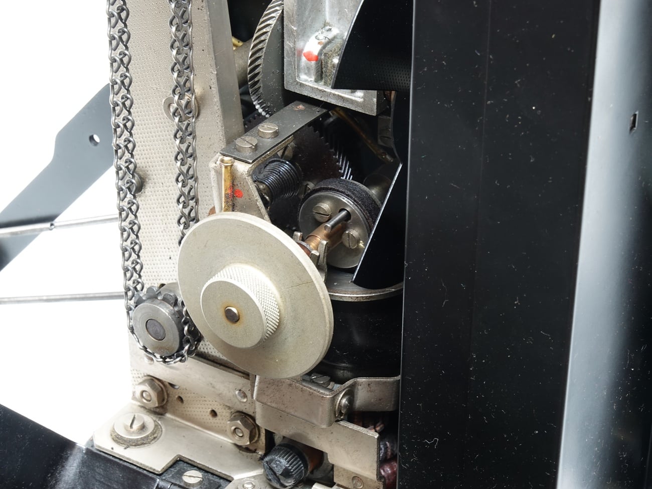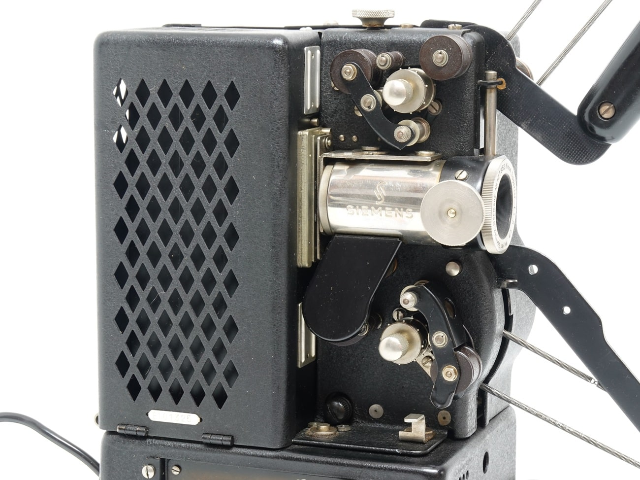 Stabiler 16-mm-Filmprojektor von Siemens, 1930er Jahre, schwarzes Stahlblechgehäuse mit Lüftungslöchern in Rautenform. Objektiv: Meyer Görlitz Kinon Superior 5 cm, Seriennummer 127952. Filmtransport und Rückwärtsprojektion/Rückspulung elektrisch. Standbild. Stufenlose Geschwindigkeitsregulierung. Helligkeit regelbar. Netzspannung: 220 Volt. Beleuchtung: 50 Volt/200 Watt, Kühlgebläse, Amperemeter. Für 120-Meter-Spulen mit Zubehörteilen können 240-Meter-Spulen genutzt werden. In verschiedenen Versionen gebaut von 1933 bis 1950.