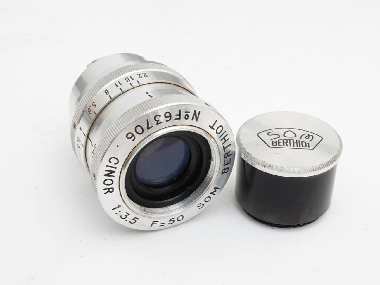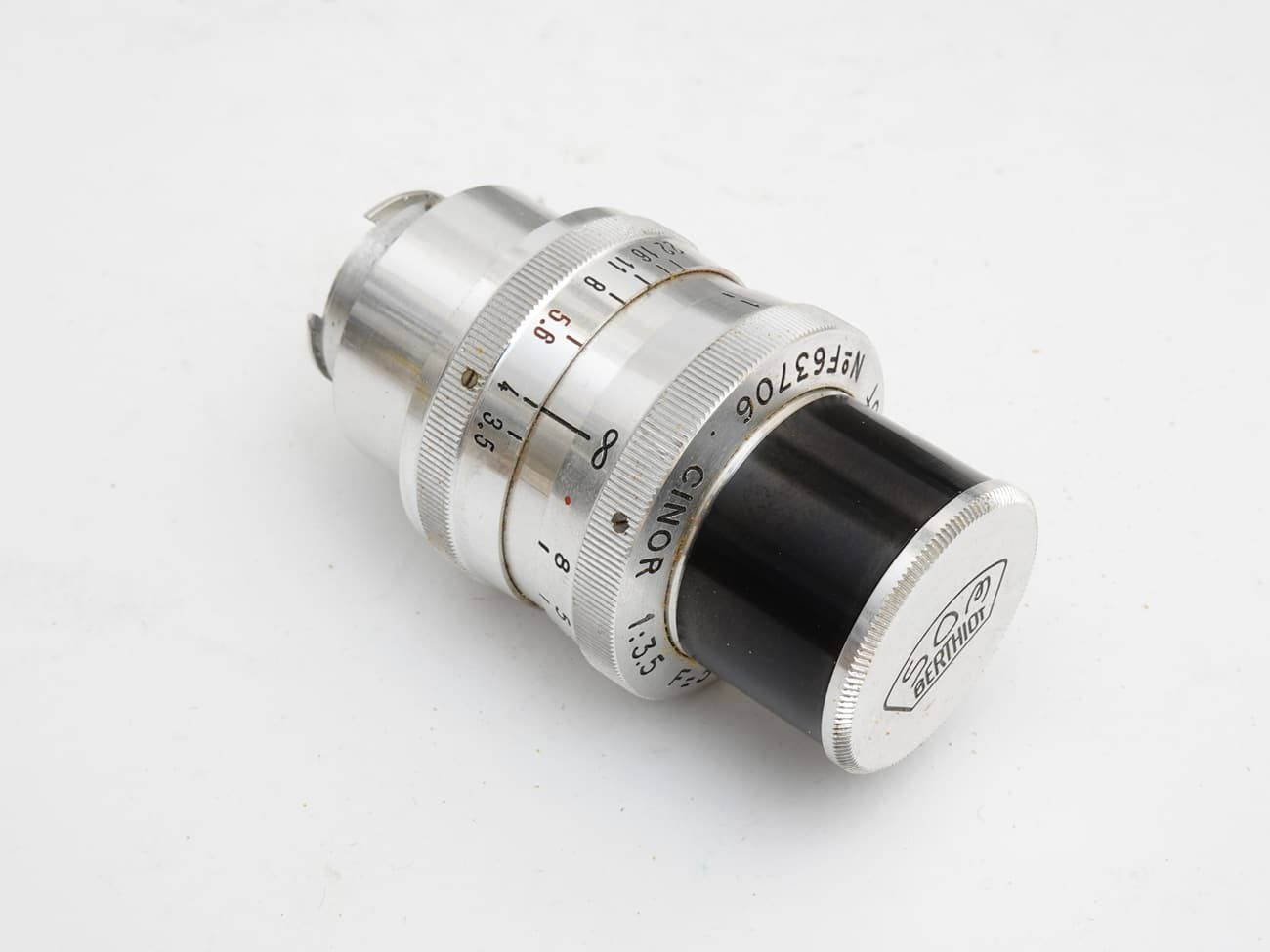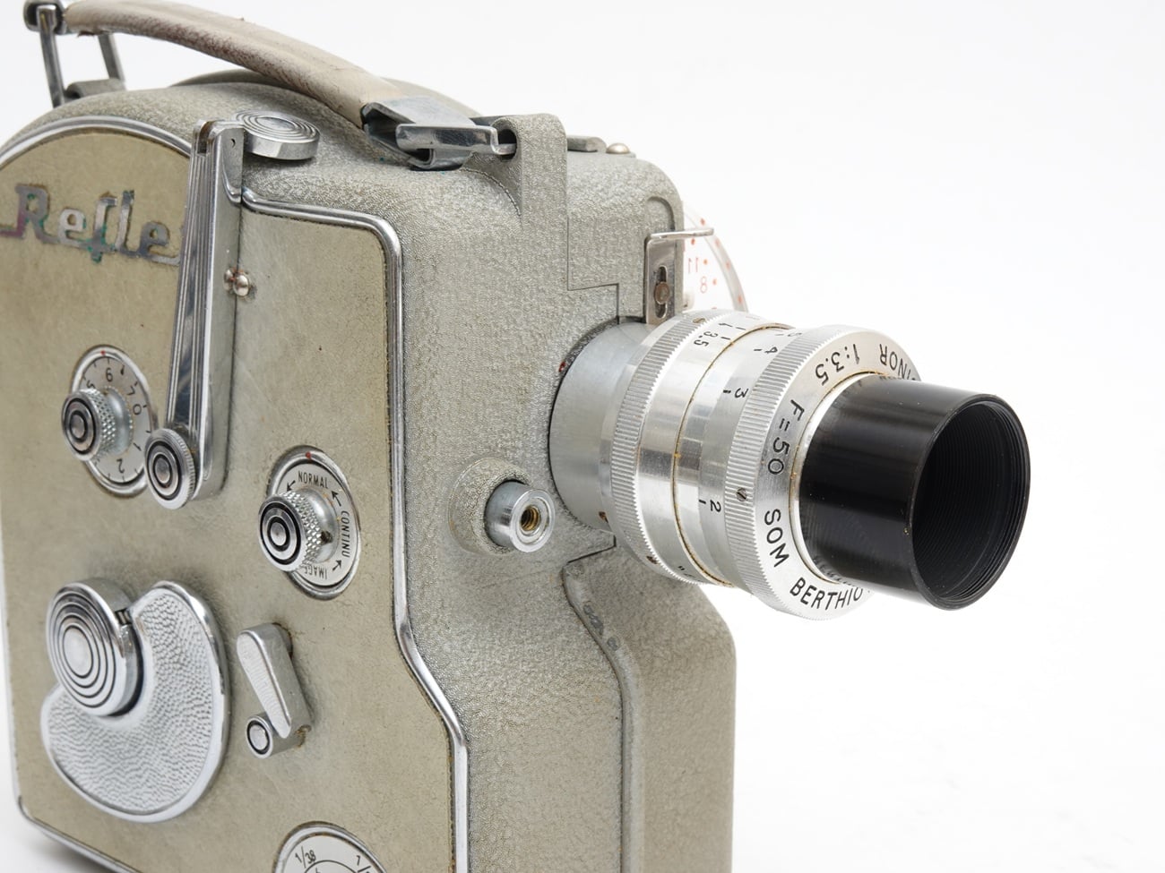 Teleobjektiv als Wechselobjektiv für Schmalfilmkameras, Bajonettanschluss passend zur Ercsam Camex Reflex 8. Manuelle Fokussierung, Irisblende, spezielle Streulichtblende, Objektivdeckel aus Leichtmetall.