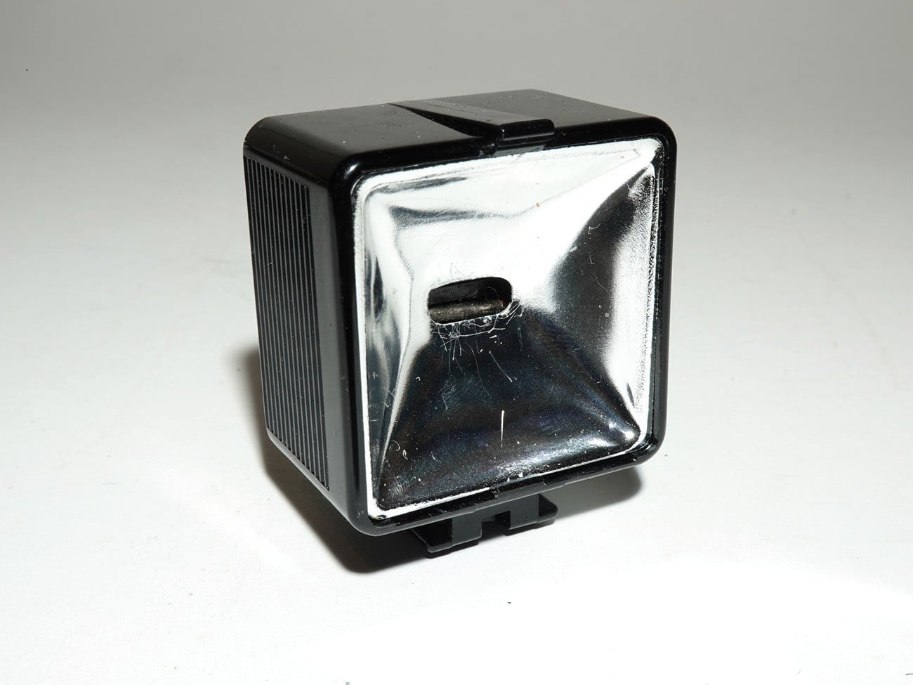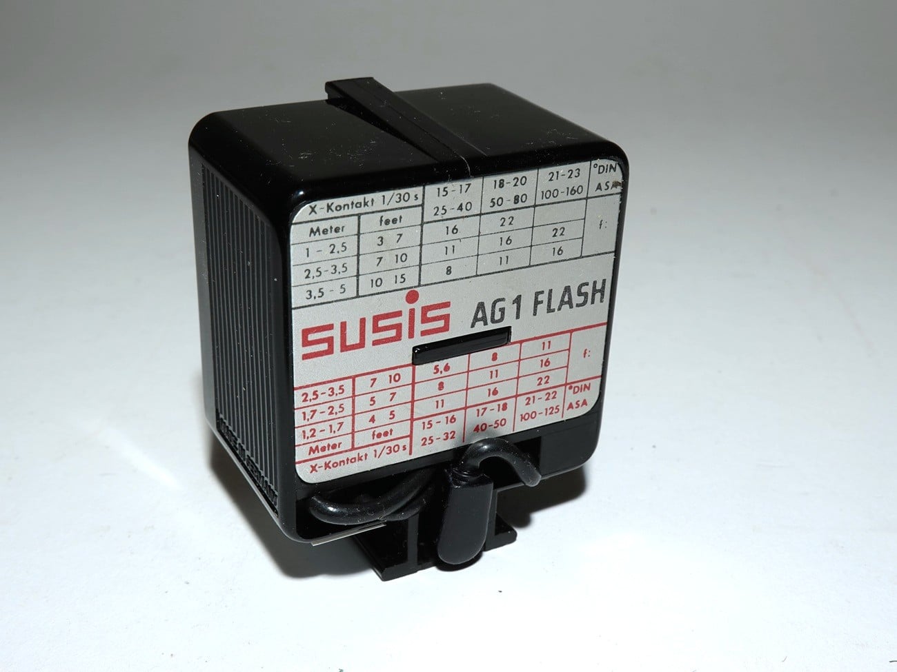Einfaches Birnenblitzgerät für AG-1-Blitzbirnchen, Made in Germany. Synchronisation über Kabel oder Mittenkontakt. Belichtungssteuerung gemäß Tabelle auf der Rückseite. Im Kunststoffetui.
