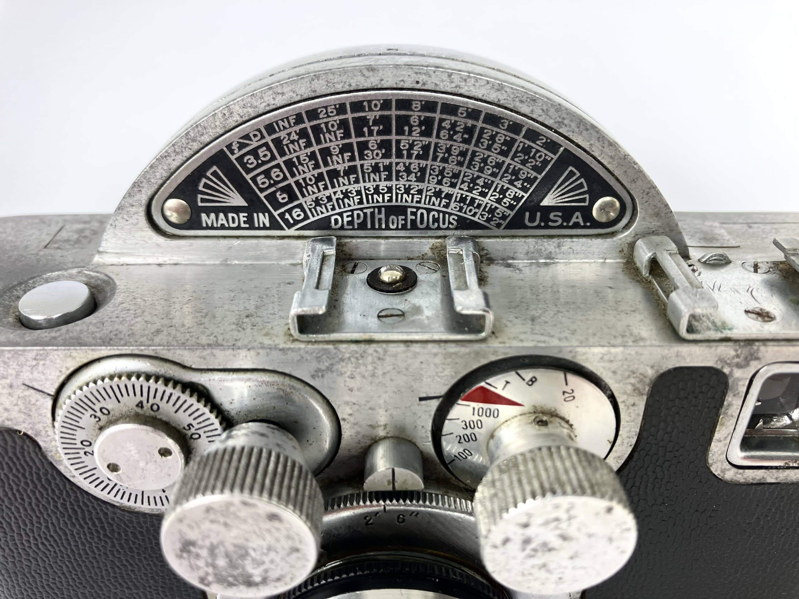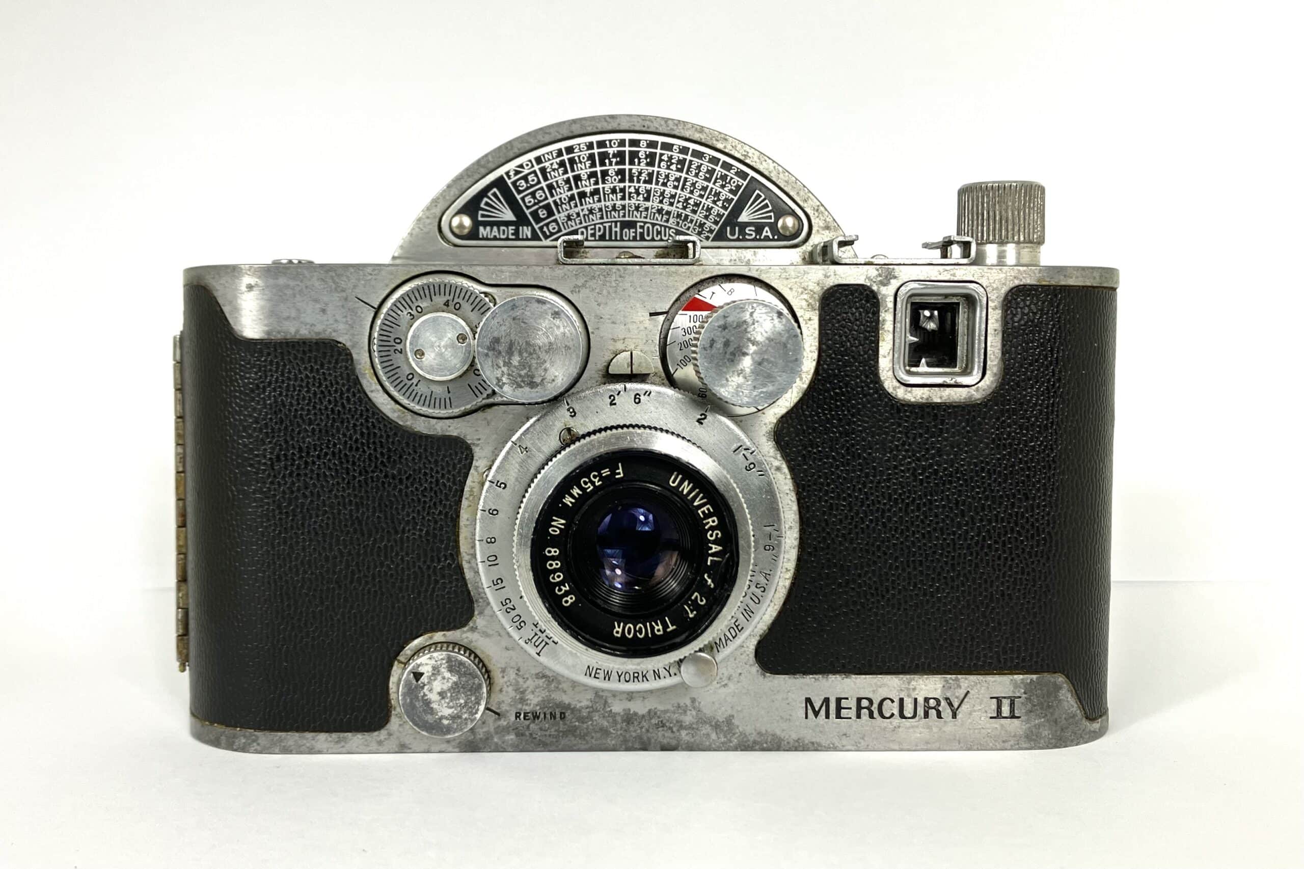 Das Objektiv ist ein wechselbares Universal Tricor 1:3,5/35 mm wie bei dem Vorkriegsmodell. Universal bot aber für die Mercury II auch ein lichtstärkeres Objektiv an (1:2/35 mm). Aus diesem Grunde hat die Kamera eine zusätzliche Tiefenschärfetabelle auf der Rückseite der oberen Gehäuserundung.