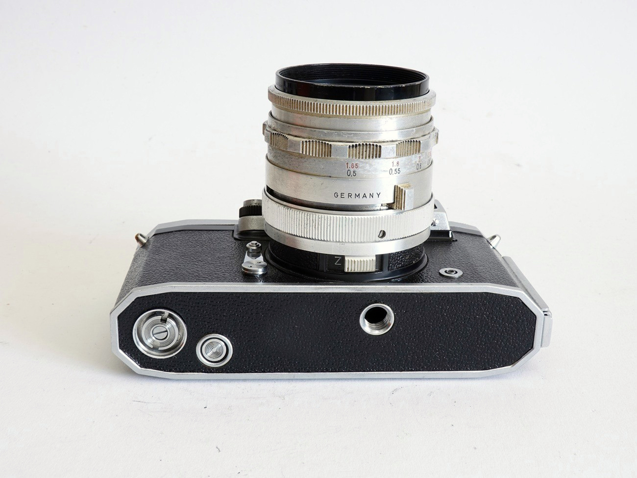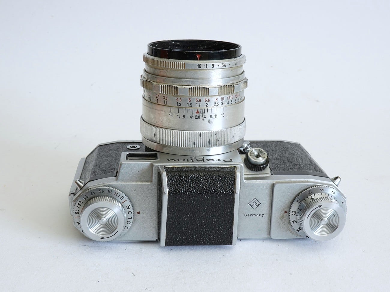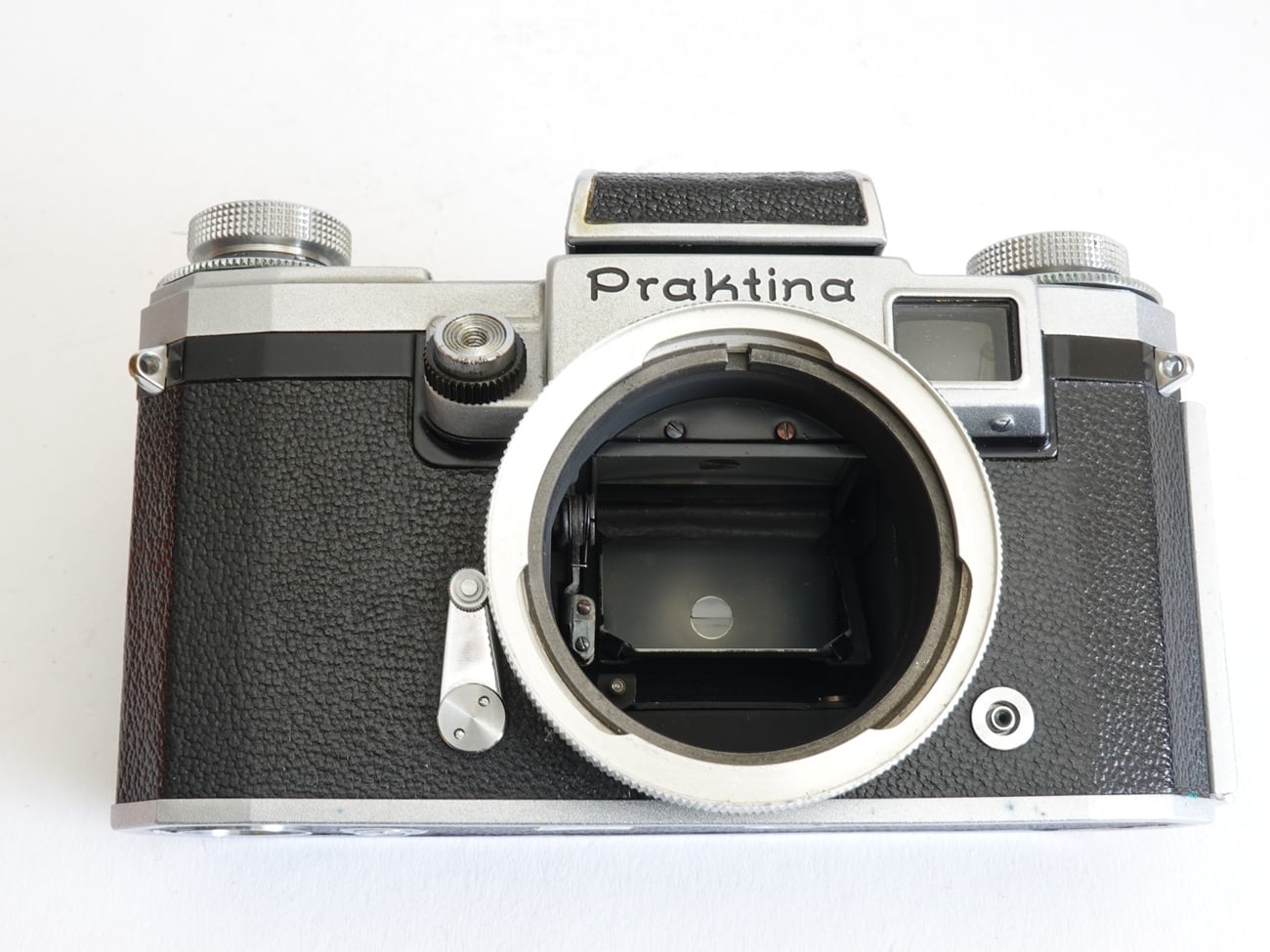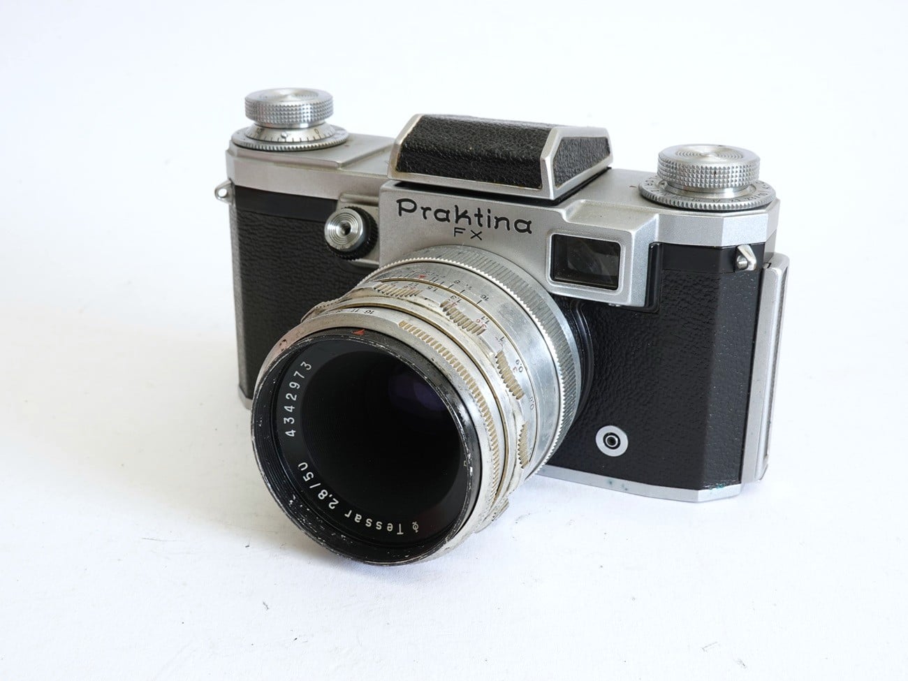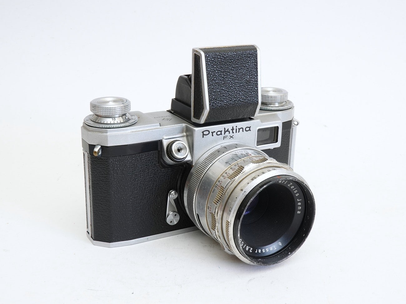 Einäugige Spiegelreflexkamera (SLR) für den Kleinbildfilm 135 (Aufnahmeformat 24 x 36 mm), hergestellt in der DDR ab 1953. Für Wechselobjektive mit Bajonettanschluss, hier mit einem Carl Zeiss Jena Tessar 1:2,8/50 mm, Seriennummer 4342973; manuelle Fokussierung. Hier mit Lichtschachtsucher, der gegen andere Suchereinsätze ausgetauscht werden konnte. Daneben befindet sich ein Fernrohrsucher. Mechanisch gesteuerter Schlitzverschluss (B, 1 bis 1/1.000 Sekunde: Vorlaufwerk); manuelle Belichtungssteuerung. Filmmerkscheibe am Rückspulrad. Manueller Filmtransport; Anschluss eines Federwerksmotors möglich. Anschlüsse für Drahtauslöser und Stativ (3/8″). Die Kamera hat nur einen Blitzsynchronkontakt, obwohl das „FX“ im Modellnamen für X- und F-Kontakt steht. „Schon im Frühjahr 1953 wurde die Praktina FX – anfangs mit einer oder auch zwei Koax-Blitzbuchsen, später mit einer genormten PC-Blitzbuchse X – in Serie gefertigt. Richard Hummel dürfte bei der Zahl „10.000“ wohl die mit Blendenvorwahl produzierten Praktina FX gemeint haben; diese Anzahl erscheint jedenfalls realistisch.“ (Horst Neuhaus)