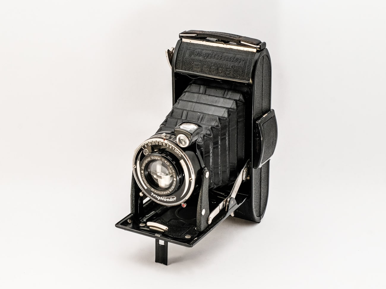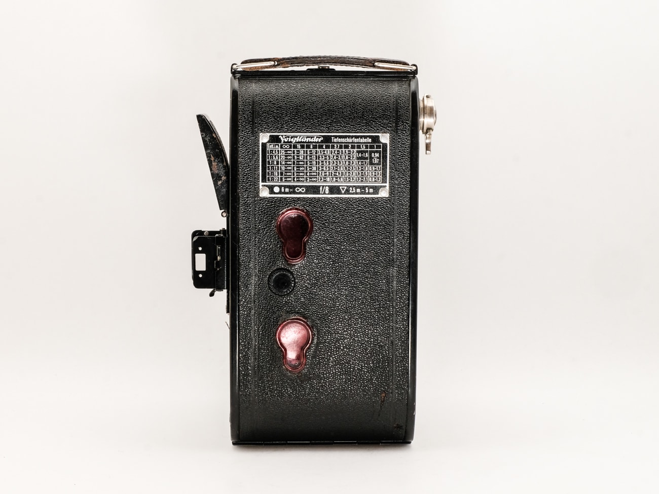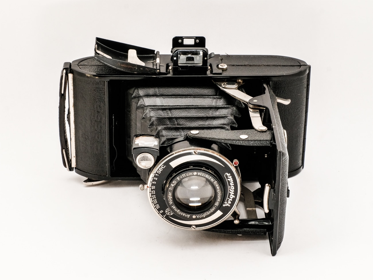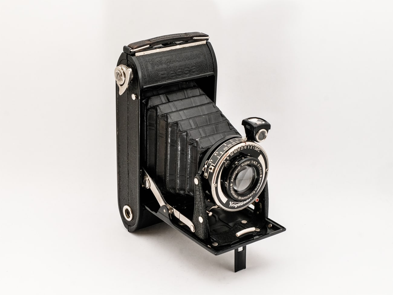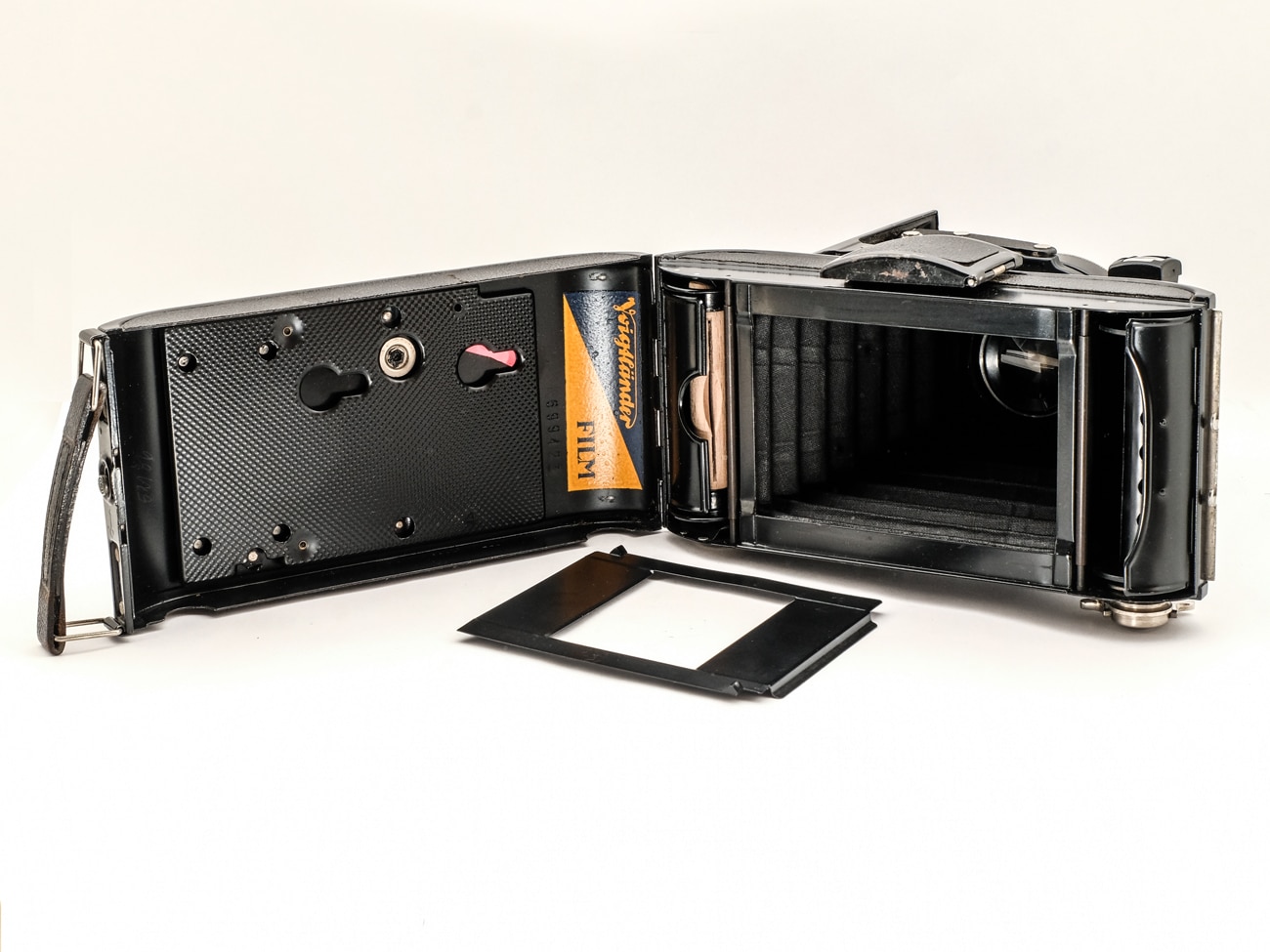 Eine Klapp-/Spreizenkamera für den Rollfilm 120, Aufnahmeformat 6 x 9 (oder 4,5 x 6 cm mit Reduzierrahmen), hergestellt 1937 bis 1942. Objektiv hier: Voigtar 1:4,5/11 cm mit Prontor-II-Verschluss 1 bis 1/150 Sekunde sowie B und T, ergänzt durch einen Drahtauslöseranschluss. Der Klappsucher ist für Halbformataufnahmen mit einer einschwenkbaren Maske ausgerüstet und im Ruhezustand mit einer Schutzkappe verschlossen, die, im Unterschied zu anderen Varianten, hier nach links öffnet. In der Objektivebene ist ein schwenkbarer Brillantsucher angebracht. Der Auslöserhebel ist an der Außenseite der Frontklappe so angeordnet, dass er in Fotografierhaltung gut erreichbar ist. An der Kamerarückwand sind neben einer „Tiefenschärfentabelle“ auch zwei abdeckbare Rotfenster für die Bildkontrolle beim Filmtransport vorhanden. An der (im Bild) linken Seite ist oben der Filmtransportknopf, unten das 3/8 Zoll Stativgewinde zu erkennen.