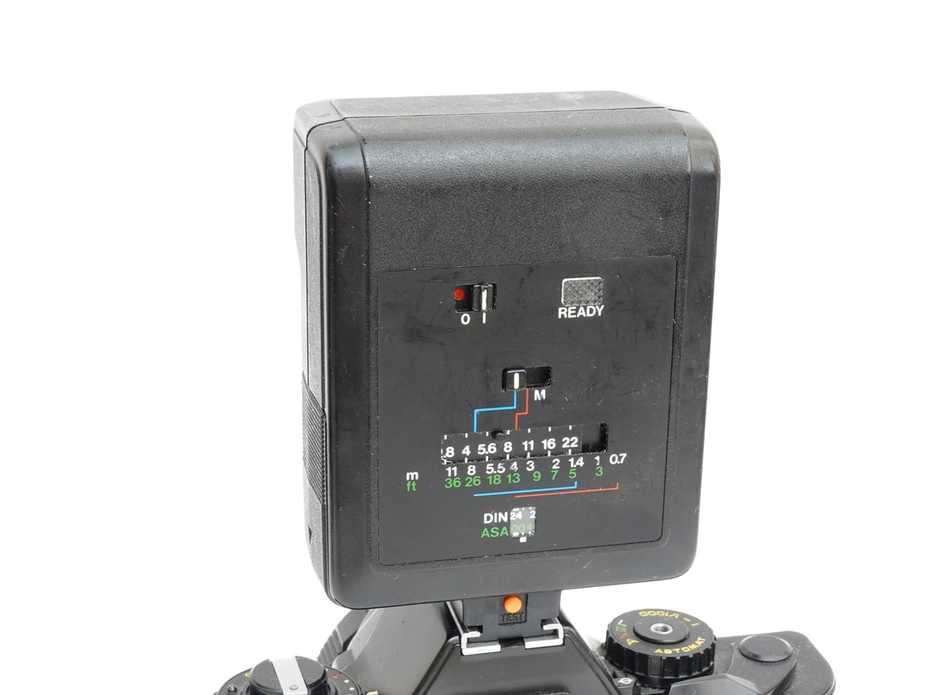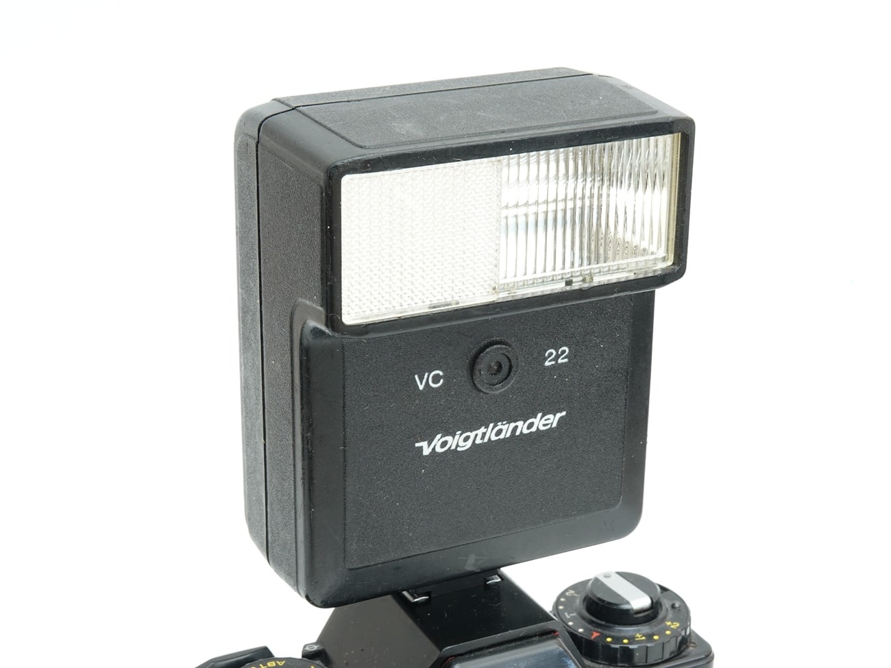 Voigtländer-Computerblitzgerät zum Aufstecken, hergestellt in Japan. Starrer Reflektor; verschiebbare Streuscheibe. Leitzahl vermutlich 22 bei 100 ASA/21 DIN; Computersteuerung mit zwei Arbeitsbereichen. Synchronisation über Mittenkontakt, Blitzbereitschaftsanzeige, Testknopf. Batteriebetrieb (4 x Zellen AA/LR 6).