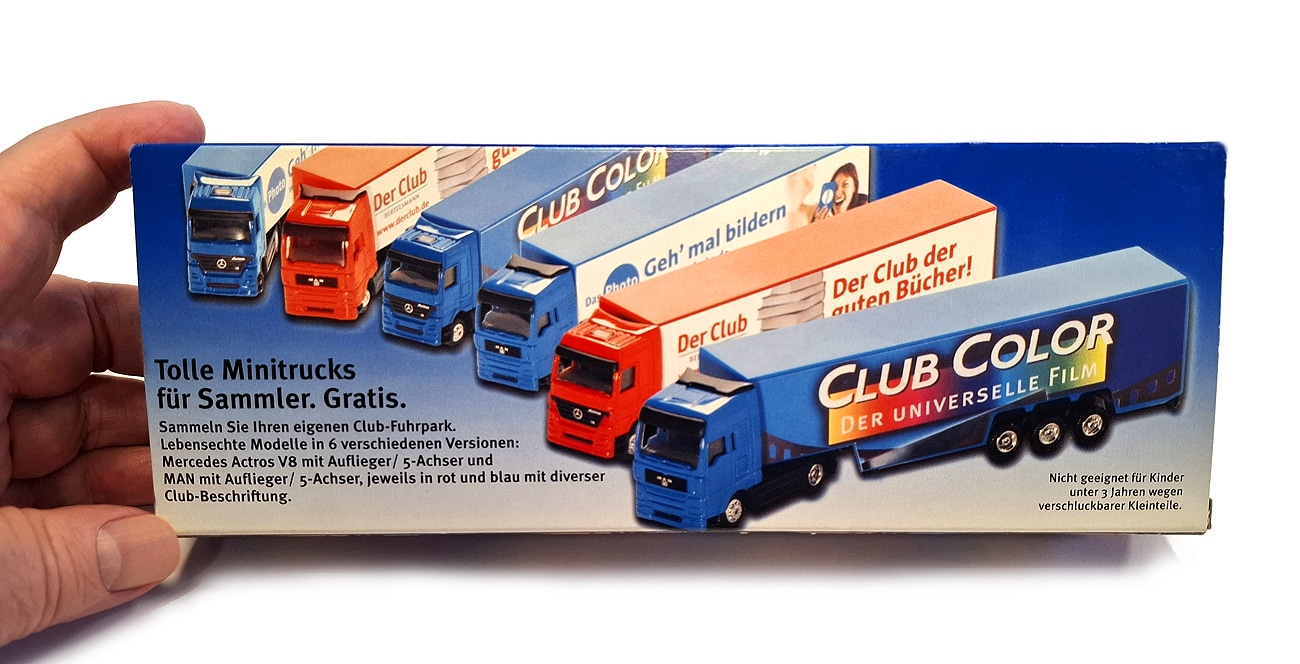 Im Angebot waren „lebensechte Modelle in 6 verschiedenen Versionen“ in Rot oder Blau mit diverser Club-Beschriftung. Hier die MAN-Ausführung in Blau mit einer Gesamtlänge von 19 cm. Das Führerhaus ist aus Metall, Fahrgestelle und Auflieger bestehen aus Kunststoff. Hergestellt vermutlich im Sommer 2004, denn die Filme sollten laut Ablaufdatum bis Juni 2006 belichtet und entwickelt sein. Gesamtabmessungen des Sets: 23,5 x 8,5 x 3,8 cm.