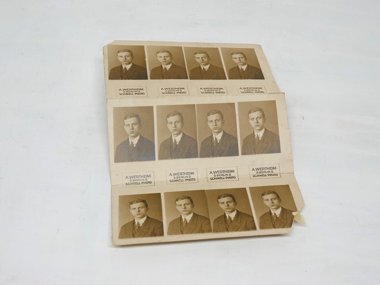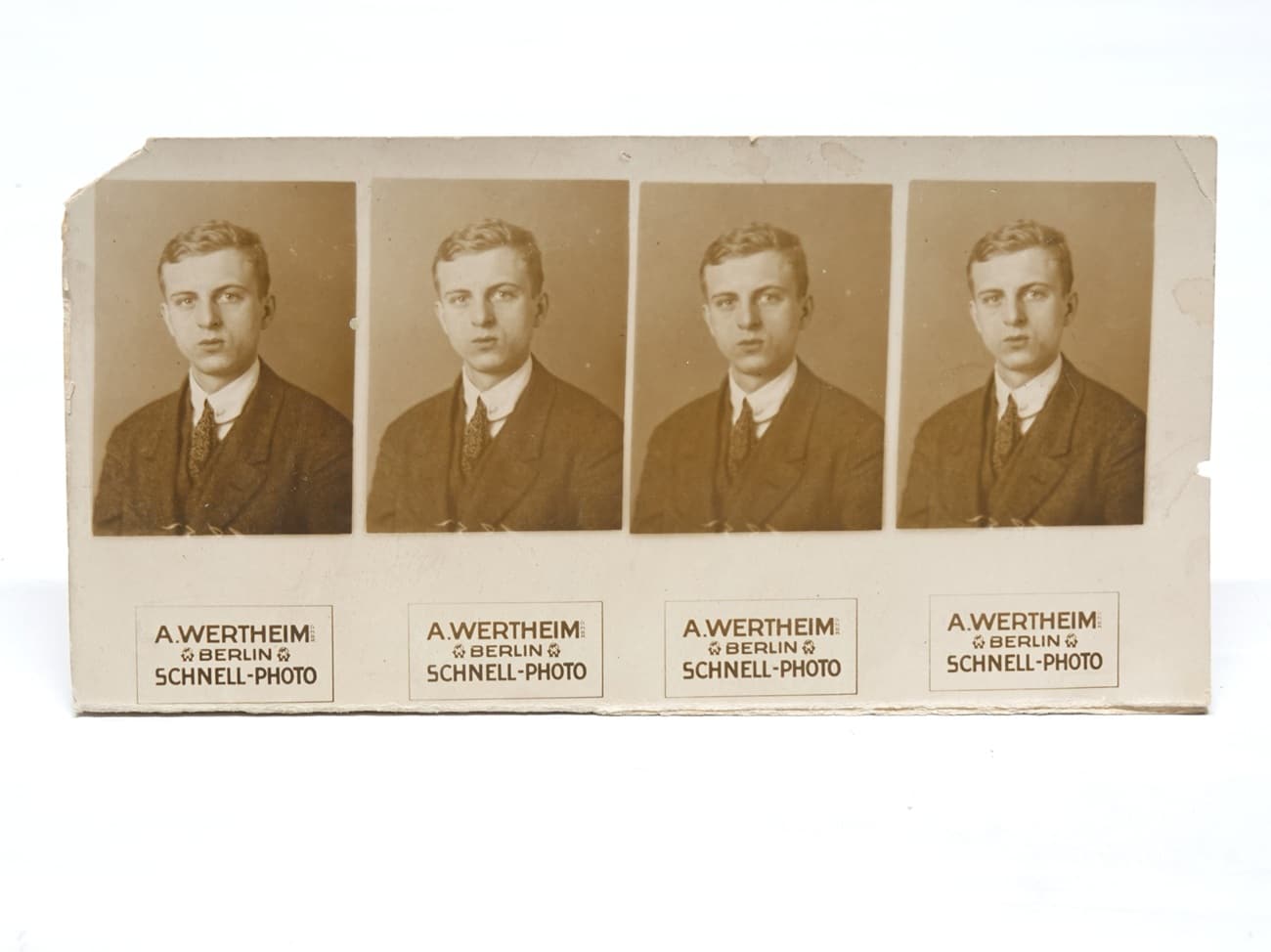 Aufnahmereihe, hergestellt in einem Fotoautomaten des Kaufhauses A. Wertheim G. m. b. H., also noch vor dessen Umwandlung in eine Aktiengesellschaft. Nach den handschriftlichen Notizen auf der Rückseite entstand das Foto im November 1921. Der Name der fotografierten Person ist Hugo Beck. Weitere Notiz: „November […] nach dem ‚Gagfah‘-Pech“. Die „Gagfah“ war die „Gemeinnützige AG für Angestellten-Heimstätten“.