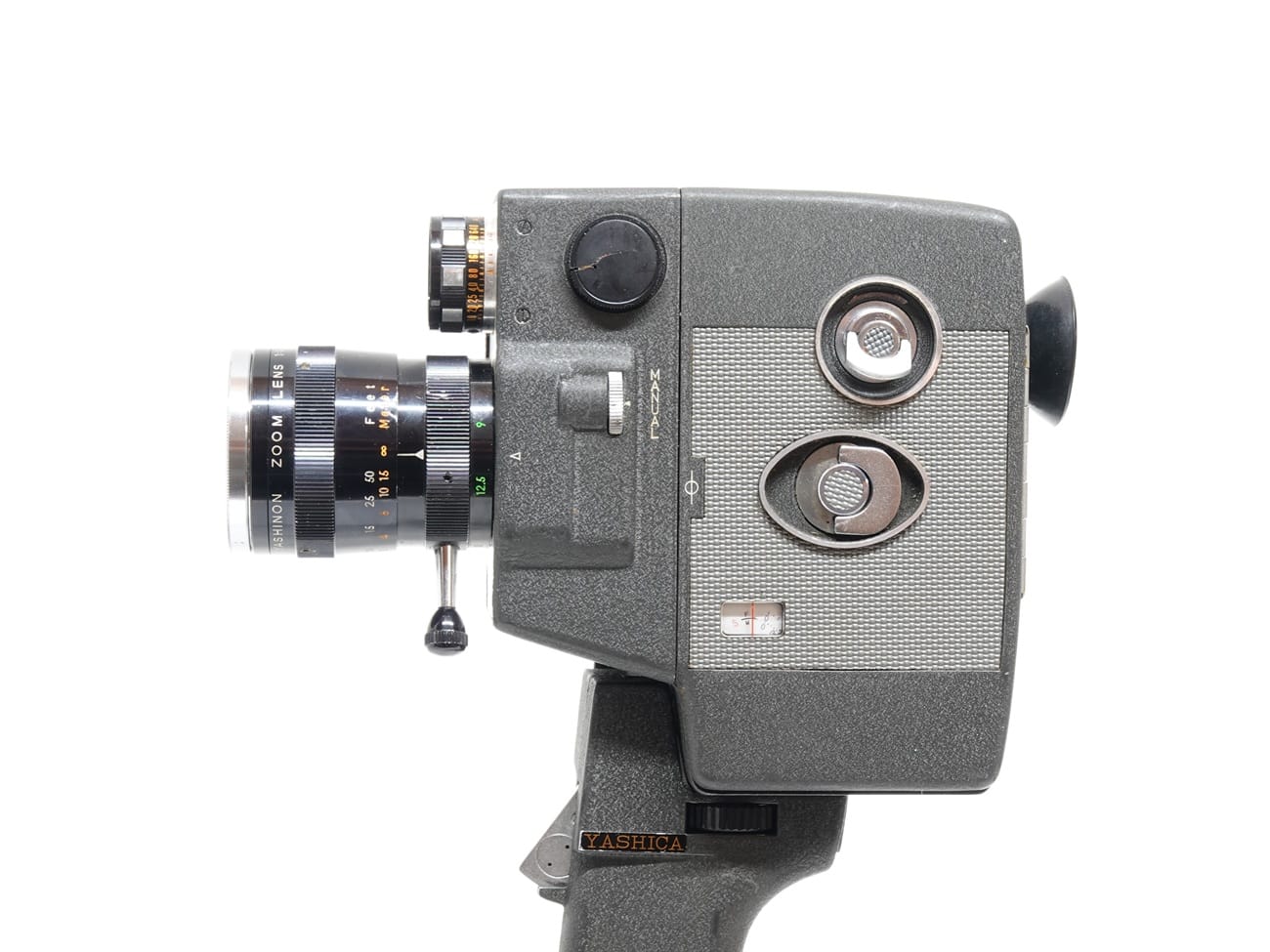 Schmalfilmkamera für Doppel-8-Spulen, hergestellt in Japan in den 1960er Jahren. Objektiv: Yashica Yashinon Zoom Lens 1:1,8/9-29 mm, Seriennummer 643268; Fokussierung und Brennweitenverstellung manuell. Reflexsucher mit Schnittbildentfernungsmesser und justierbarem Okular. Elektrischer Filmtransport (12, 16, 24 Bilder pro Sekunde); automatische oder manuelle Belichtungssteuerung. CdS-Messzelle oberhalb des Objektivs. Möglichkeit für Rückspulung und Überblendung. Anschlüsse für elektrischen Fernauslöser, Drahtauslöser und Stativ (1/4″). Stromversorgung: 4 x Batterien AA (Laufwerk), 1 x Batterie Knopfzelle. Im Museum mit anschraubbarem Pistolengriff, Bereitschaftstasche und einer Verpackung „Kodachrome 25 Tageslicht-Film“, zu entwickeln bis November 1977.
