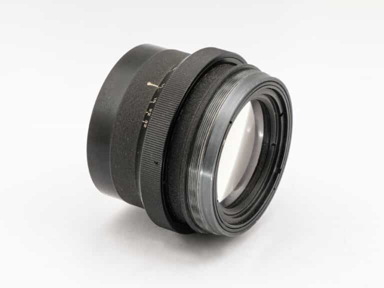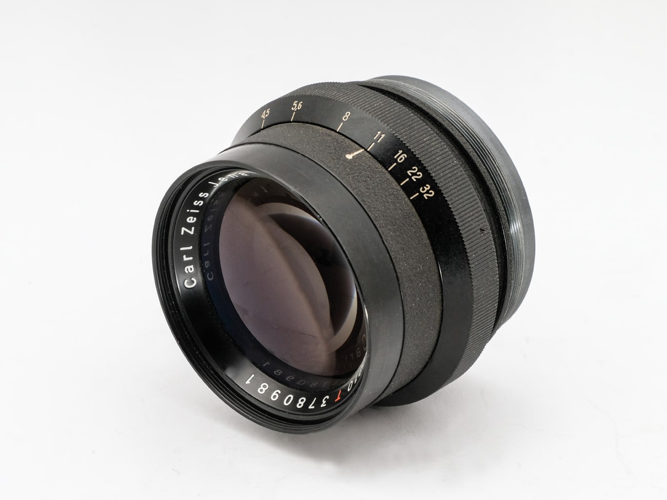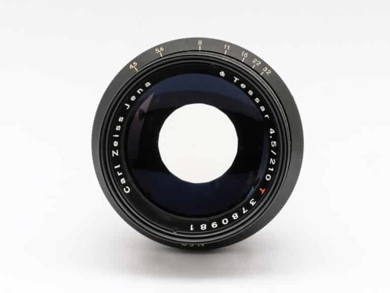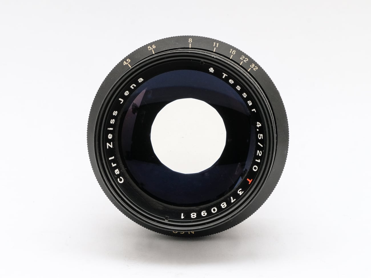 Tessar-Objektiv von Carl Zeiss Jena für Großformatkameras mit Platten oder Planfilm 13 x 18 cm, Lichtstärke 1:4,5, Brennweite 210 mm, Bildkreis 250 mm, produziert von Anfang der 1950er- bis Ende der 1980er-Jahre. (Seriennummer 3780981, Baujahr etwa. 1952). Klassischer Tessartyp mit vier Linsen in drei Gruppen, Blendenbereich 4,5 bis 32, Befestigung an der Kamera mit Gewinde 62 mm. Das Objektiv hat keinen Verschluss, es war unter anderem vorgesehen für den Einsatz an großformatigen Reflexkameras mit Schlitzverschluss.