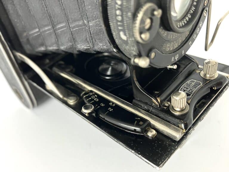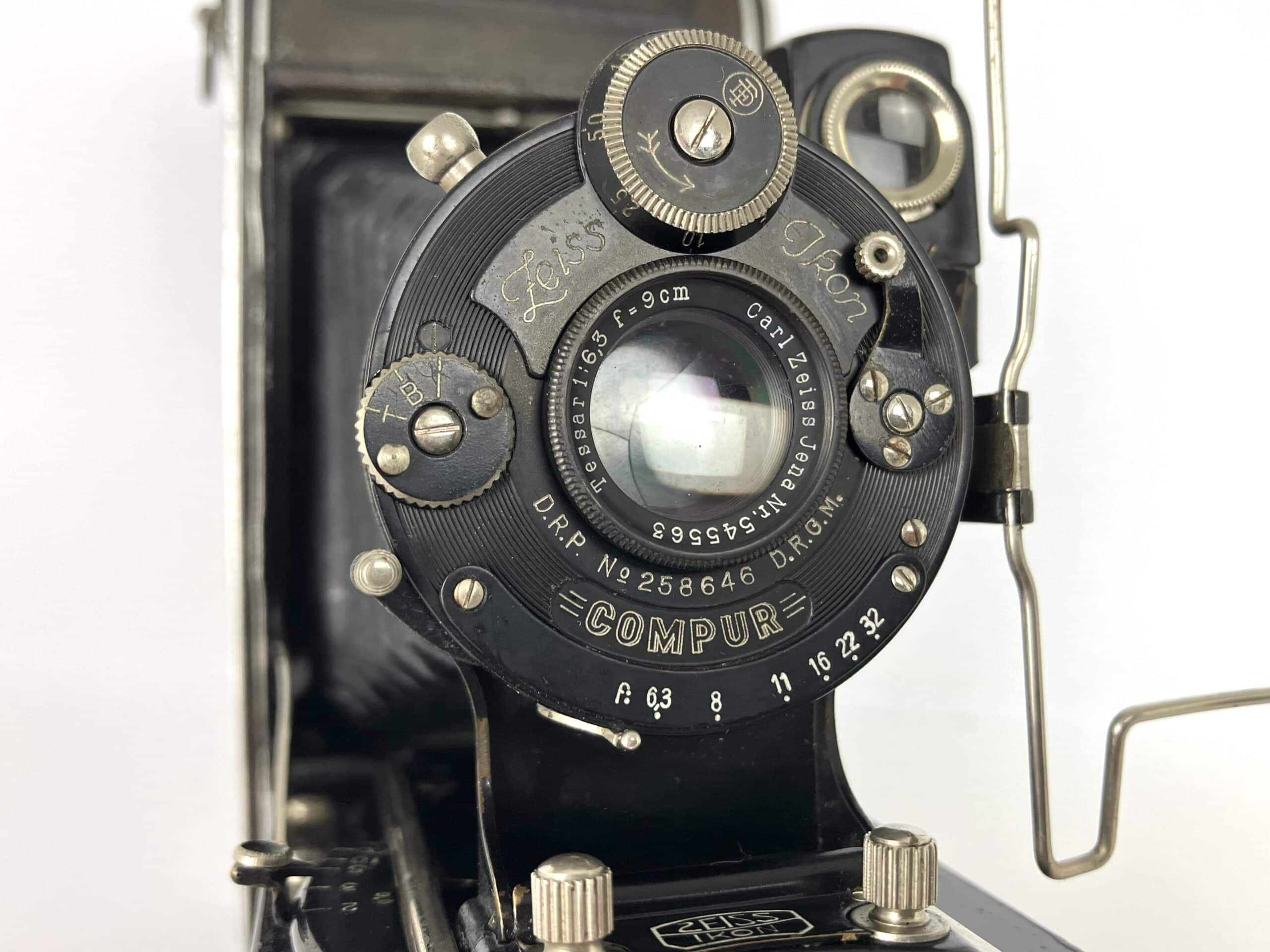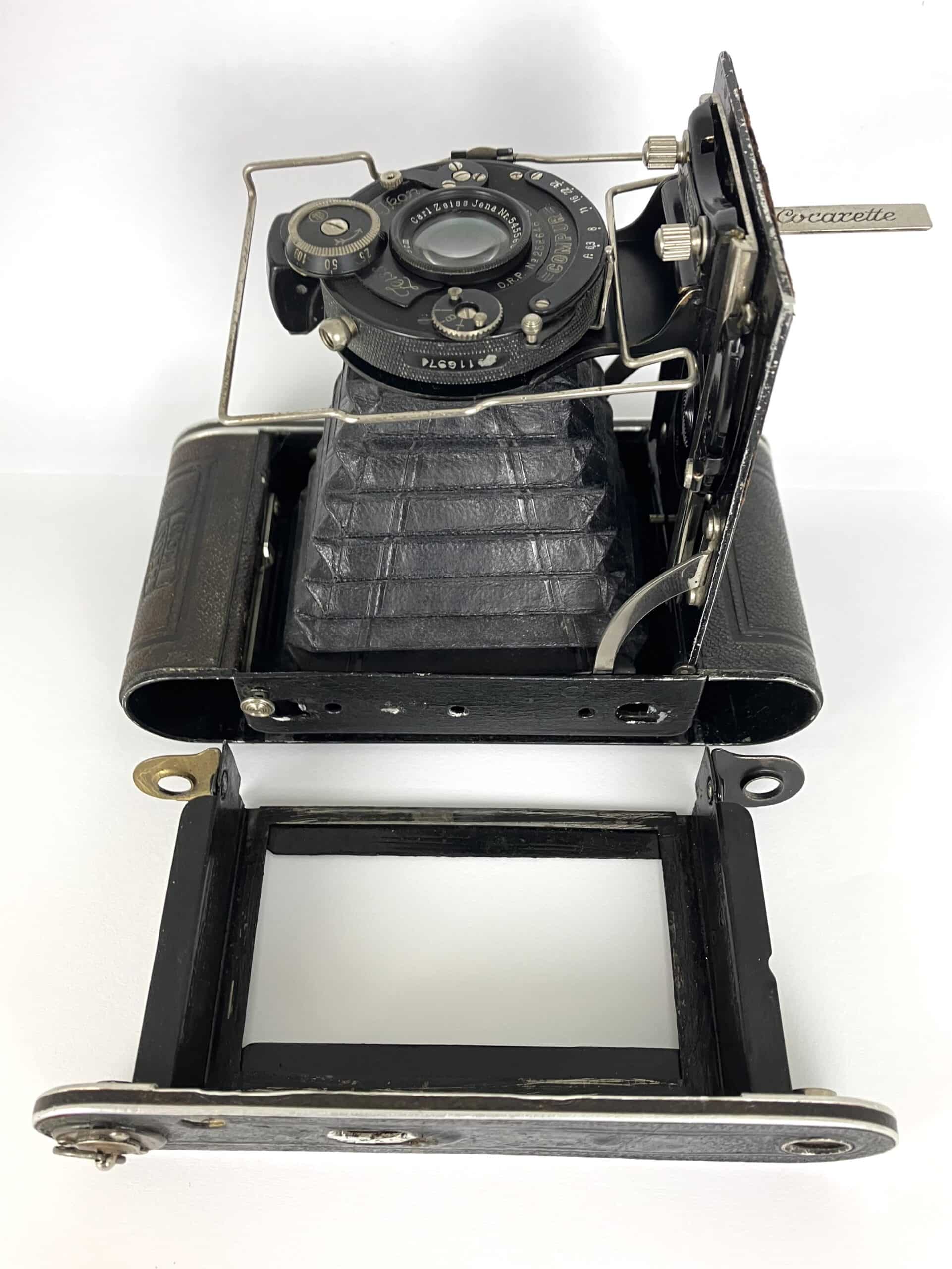 Vorgestellt wird hier die kleinste Cocarette von Zeiss Ikon mit Tessar-Objektiv. Die Marke Coca Cola wurde zwar schon 1893 registriert, der Name Cocarette hat damit aber nichts zu tun. Das Getränk wurde erst 1929 in Deutschland eingeführt, da gab es diese Cocarette schon. Kameras mit dieser Bezeichnung wurden ab 1919 zunächst im Contessa Nettel Werk in Stuttgart produziert. Daher stammt auch der Name, er ist eine Abkürzung aus COntessa CAmera Werke. Zeiss Ikon übernahm Contessa Nettel im Jahr 1926 und produzierte die Cocarette weiter bis etwa 1931. Die vorgestellte Cocarette dürfte aus der Anfangszeit dieser Übernahme, also etwa um 1927 stammen, das Objektiv ist seiner Seriennummer nach sogar etwas früher produziert worden. Die Cocarette gab es in fünf verschiedenen Formaten für Rollfilm, hier mit dem nicht so häufigen Negativformat 5 x 7,5 cm (Rollfilm 129/N-6).