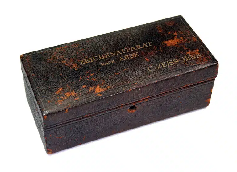 Heute wohl eine Rarität: der „Zeichenapparat nach Abbe“, etwa 1900, zum Aufstecken auf ein Mikroskop. Beledertes Holzkästchen (Größe: 14,5 x 7 x 5,5 cm), innen wie zu der Zeit üblich mit Samt ausgeschlagen. Damit konnte man – vereinfacht ausgedrückt – mikroskopische Präparate auf Papier projizieren und leichter nachzeichnen.
