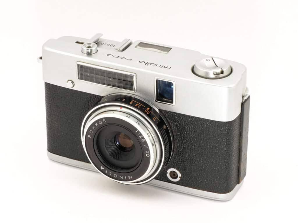 Sucherkamera für Kleinbildfilm 135, Halbformat 18 x 24 mm, von Minolta, Japan, ab 1962. Diese Kamera ermöglicht bis zu 72