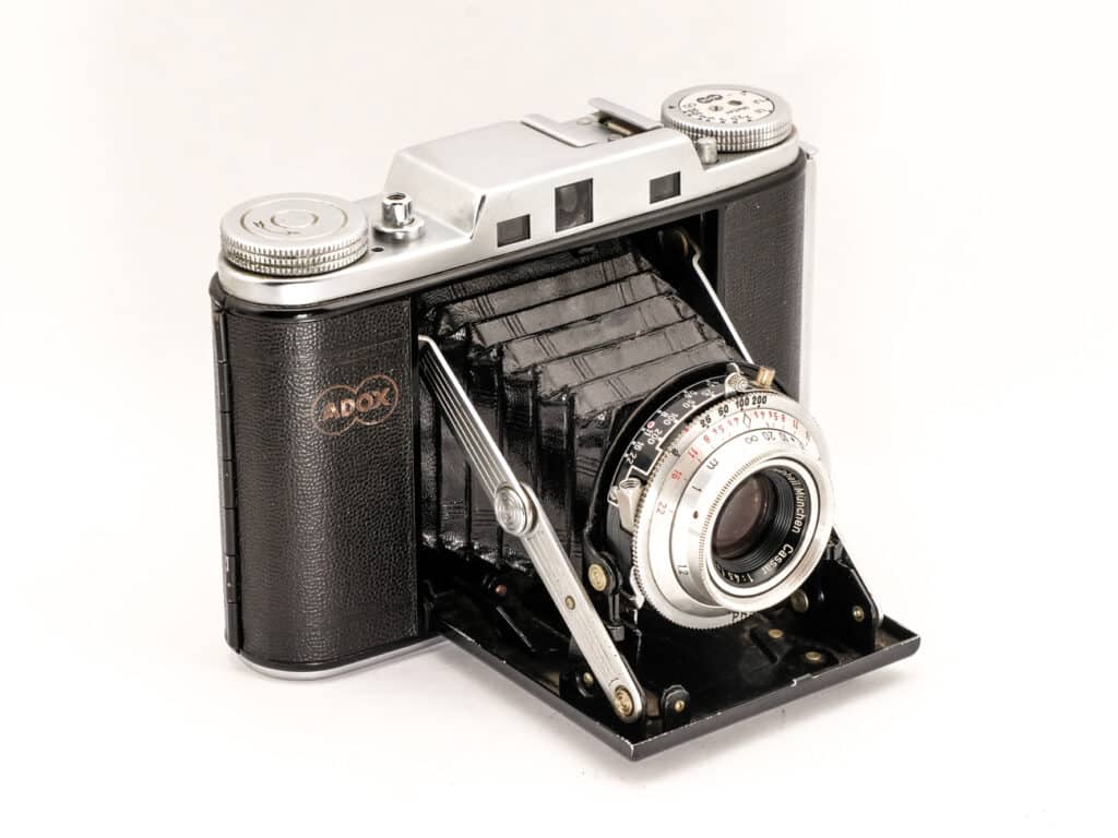 Messsucherkamera für Rollfilm 120, Format 6 x 6, von ADOX, 1953. Diese Kamera gehört zu einer ADOX-Golf-Reihe 6 x 6