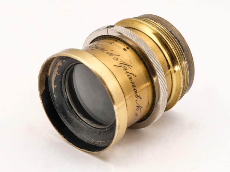 Klassisches Messingobjektiv, produziert ab etwa 1900, kein Hersteller vermerkt. Brennweite um die 140 mm (rechnerisch ermittelt), Blendenbereich 8 bis 44.