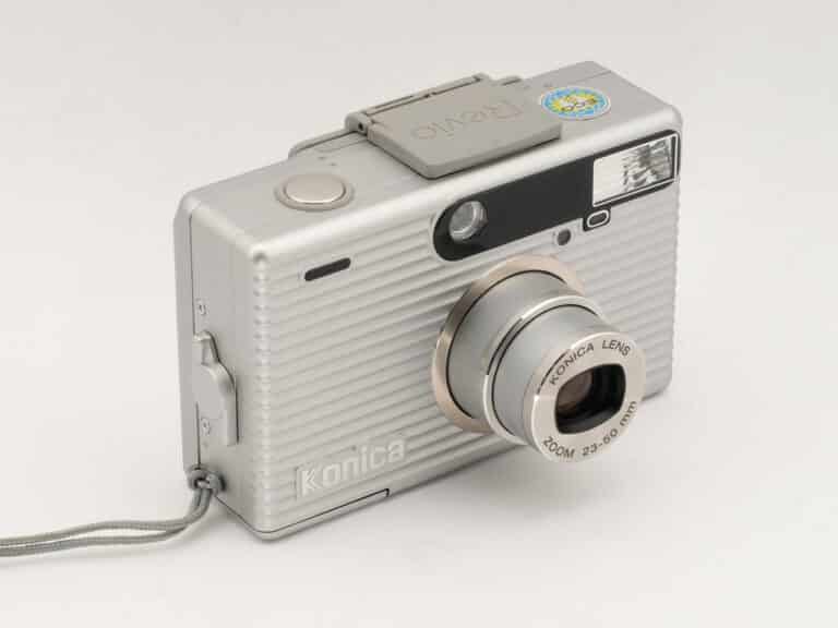 Sucherkamera (1990er Jahre) im „Wellblechlook“, für den APS-Film (Aufnahmeformat: 16,7 x 30,2 mm). Eine Besonderheit ist die Selbstportrait-Funktion: Ein an