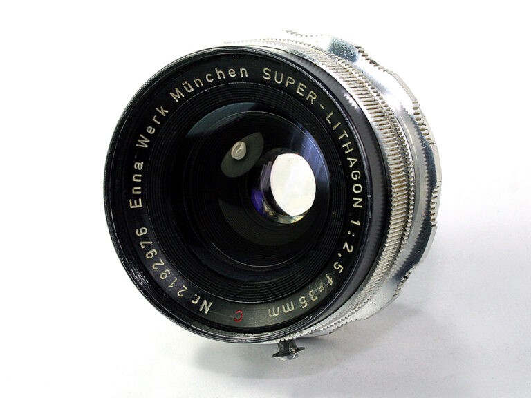Leichtes Weitwinkel 1:2,5/35 mm für Kleinbild-Spiegelreflex-Kameras mit M-42-Gewindeanschluss. Manuelle Scharfstellung. Kleinste Blende: 22, Bildwinkel: 37,8° (kurze Seite), 54,4° (lange Seite),