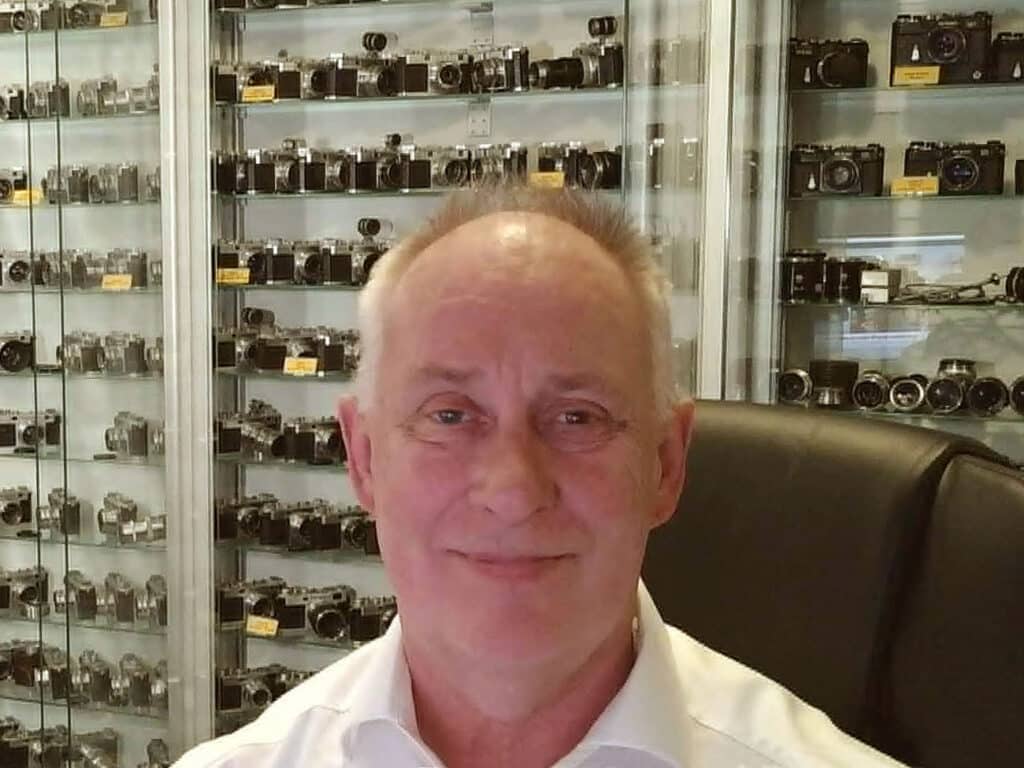 Das Deutsche Kameramuseum in Plech freut sich über eine weitere großherzige Spende eines prominenten deutschen Photographica-Sammlers: Der in der Nikon-Liebhaber-Szene wohlbekannte und international bestens vernetzte Sammler Lutz Steinfurth aus Wassenberg im Landkreis Heinsberg (Nordrhein-Westfalen) - im Bild vor einem kleinen Teil seiner Preziosen - überließ uns Ostern 2026 auf einen Schlag 10 ausgesprochene Raritäten aus seinen Schätzen und arbeitet jetzt auch aktiv im Vorstand des Fördervereins als Beisitzer mit.